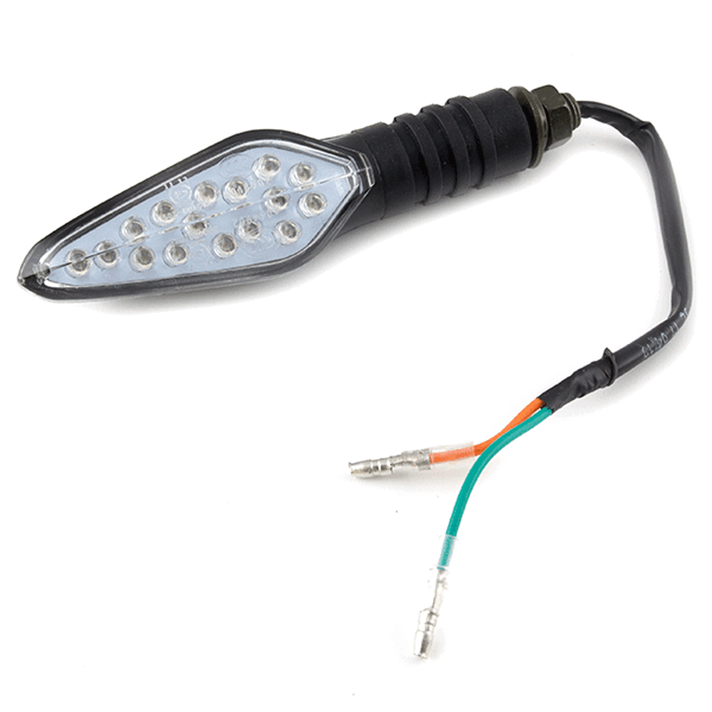 The indicator on a motorcycle is a signaling device used to communicate the rider's intent to turn or change lanes. It typically consists of a light that flashes to alert other road users. Mounted on the front and rear of the bike, indicators are essential for safety, helping to ensure that the rider's movements are clearly visible to others.