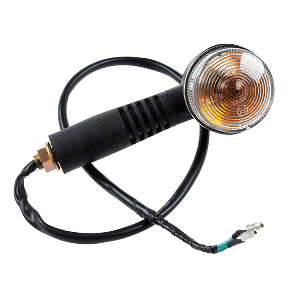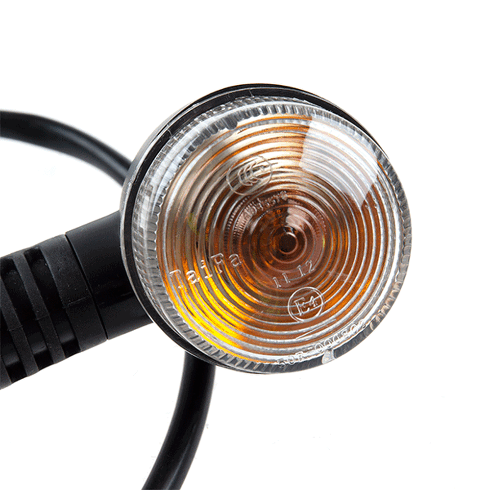 The indicator on a motorcycle is a signaling device used to communicate the rider's intent to turn or change lanes. It typically consists of a light that flashes to alert other road users. Mounted on the front and rear of the bike, indicators are essential for safety, helping to ensure that the rider's movements are clearly visible to others.