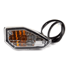 The indicator on a motorcycle is a signaling device used to communicate the rider's intent to turn or change lanes. It typically consists of a light that flashes to alert other road users. Mounted on the front and rear of the bike, indicators are essential for safety, helping to ensure that the rider's movements are clearly visible to others.