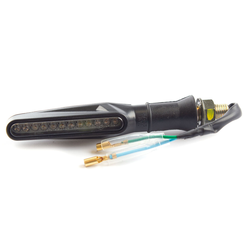 The indicator on a motorcycle is a signaling device used to communicate the rider's intent to turn or change lanes. It typically consists of a light that flashes to alert other road users. Mounted on the front and rear of the bike, indicators are essential for safety, helping to ensure that the rider's movements are clearly visible to others.