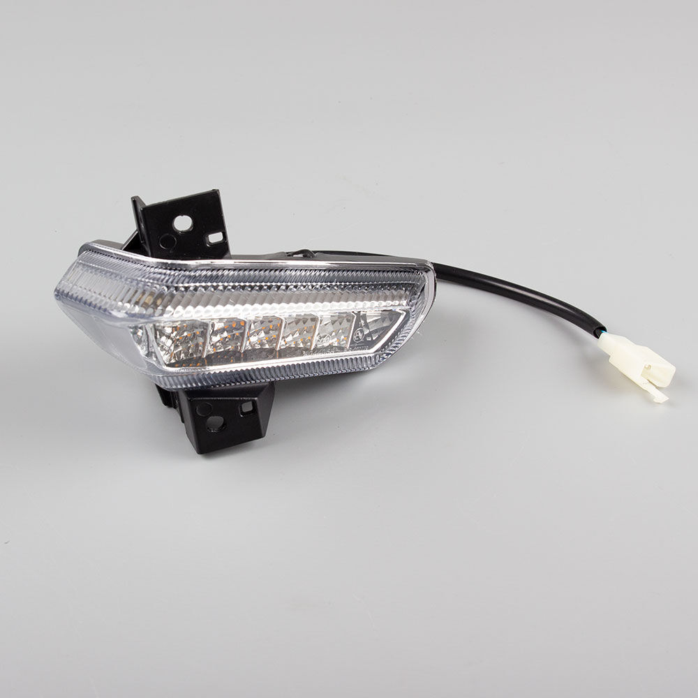 The indicator on a motorcycle is a signaling device used to communicate the rider's intent to turn or change lanes. It typically consists of a light that flashes to alert other road users. Mounted on the front and rear of the bike, indicators are essential for safety, helping to ensure that the rider's movements are clearly visible to others.