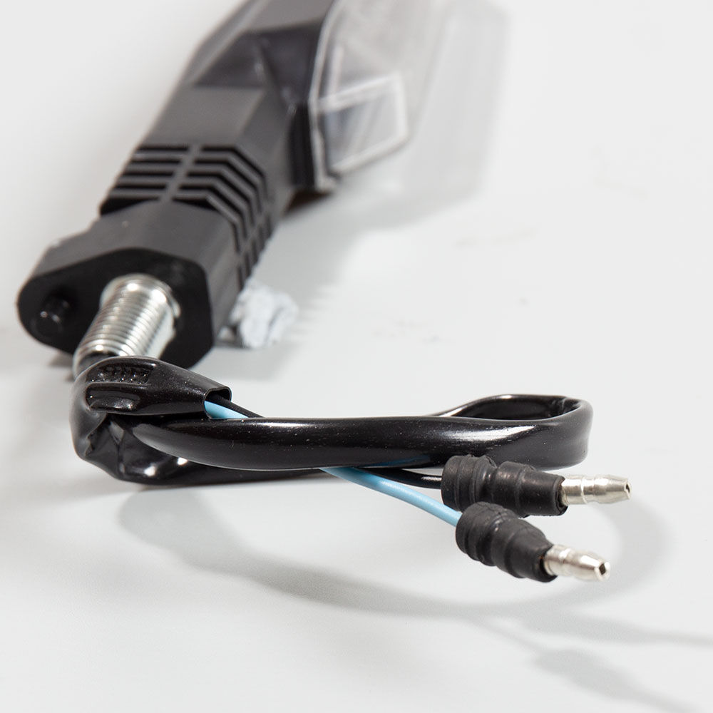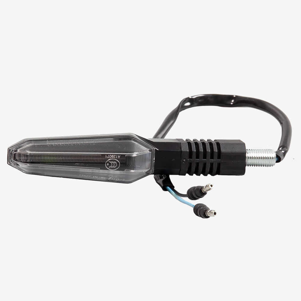 The indicator on a motorcycle is a signaling device used to communicate the rider's intent to turn or change lanes. It typically consists of a light that flashes to alert other road users. Mounted on the front and rear of the bike, indicators are essential for safety, helping to ensure that the rider's movements are clearly visible to others.