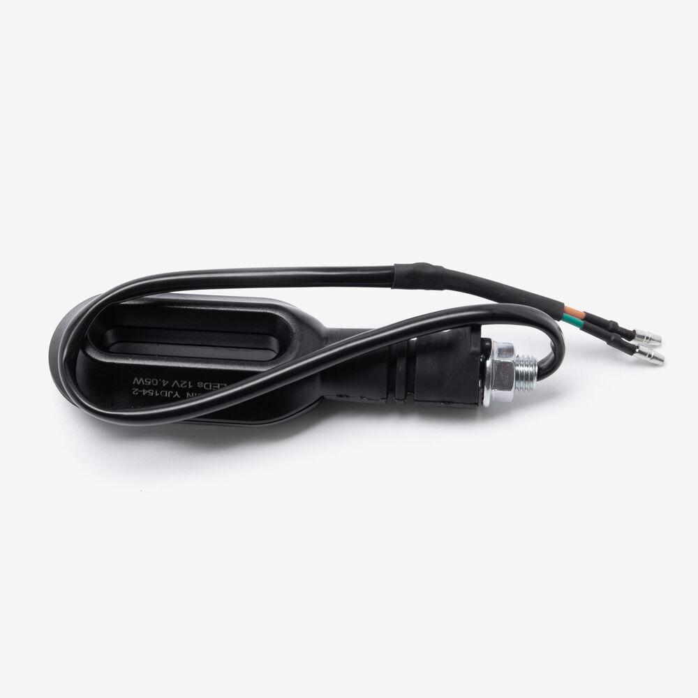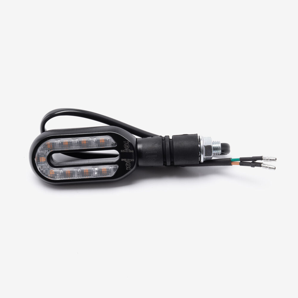 The indicator on a motorcycle is a signaling device used to communicate the rider's intent to turn or change lanes. It typically consists of a light that flashes to alert other road users. Mounted on the front and rear of the bike, indicators are essential for safety, helping to ensure that the rider's movements are clearly visible to others.