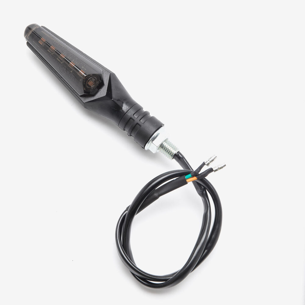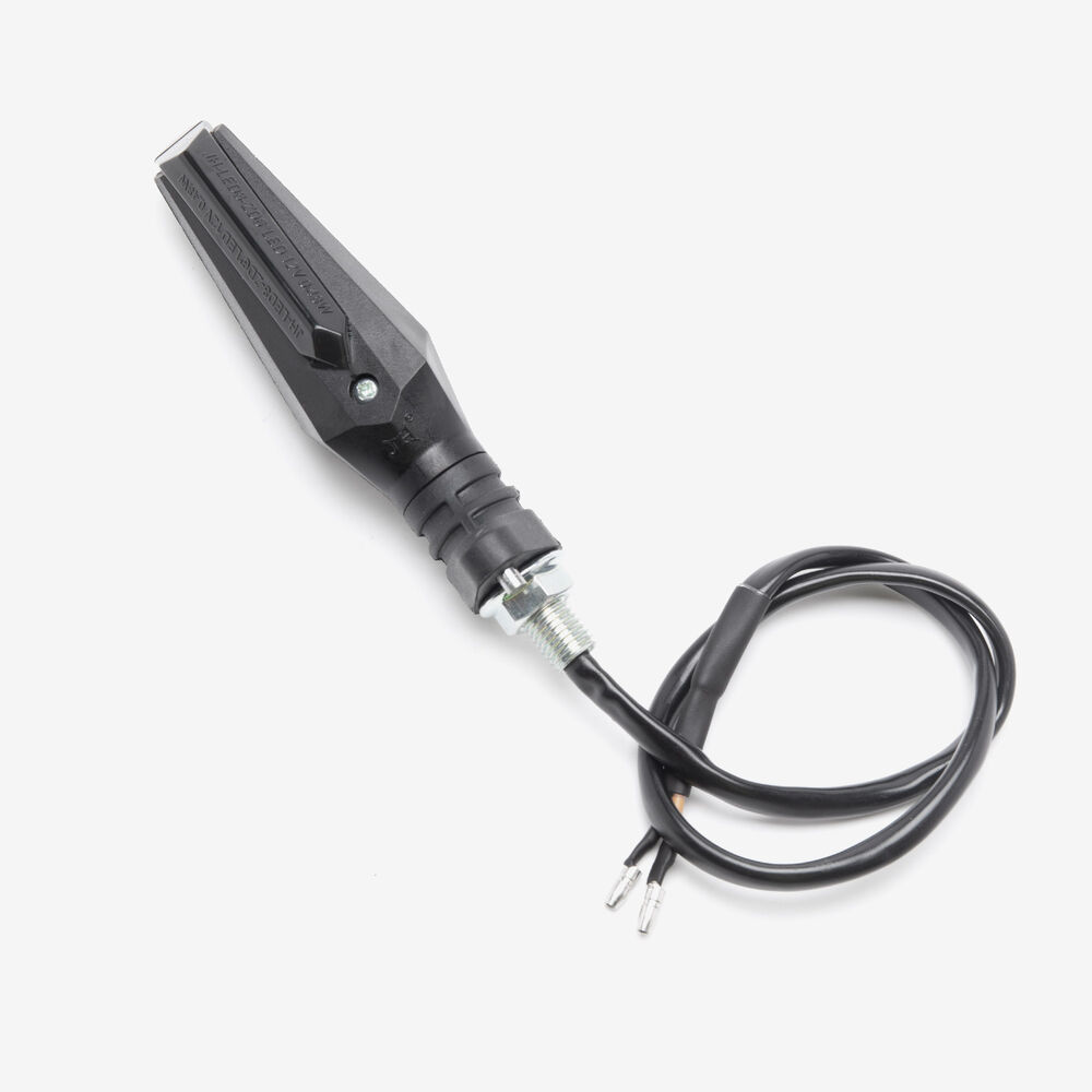 The indicator on a motorcycle is a signaling device used to communicate the rider's intent to turn or change lanes. It typically consists of a light that flashes to alert other road users. Mounted on the front and rear of the bike, indicators are essential for safety, helping to ensure that the rider's movements are clearly visible to others.