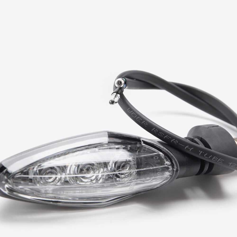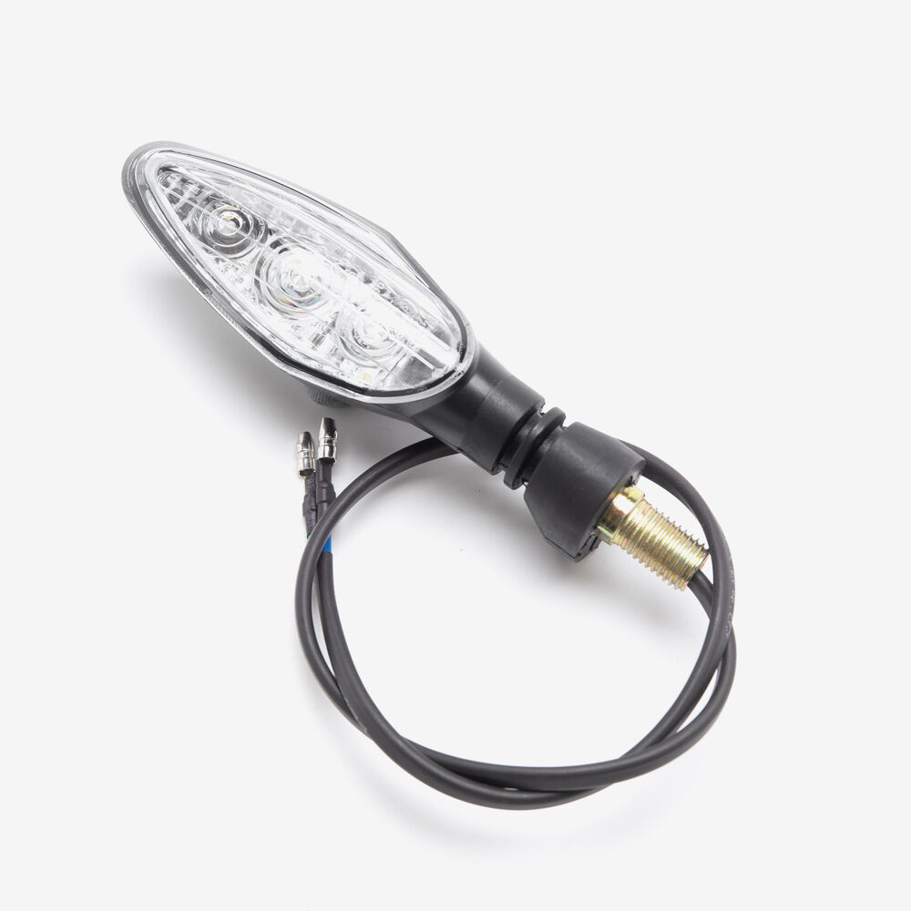 The indicator on a motorcycle is a signaling device used to communicate the rider's intent to turn or change lanes. It typically consists of a light that flashes to alert other road users. Mounted on the front and rear of the bike, indicators are essential for safety, helping to ensure that the rider's movements are clearly visible to others.