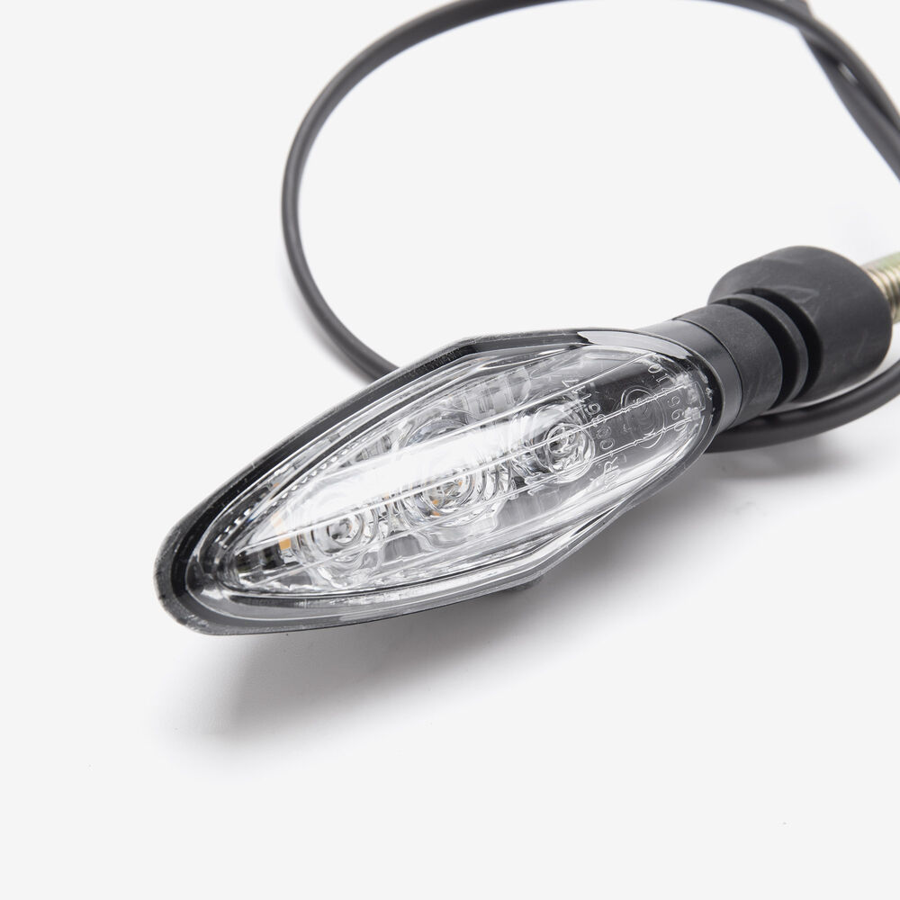 The indicator on a motorcycle is a signaling device used to communicate the rider's intent to turn or change lanes. It typically consists of a light that flashes to alert other road users. Mounted on the front and rear of the bike, indicators are essential for safety, helping to ensure that the rider's movements are clearly visible to others.