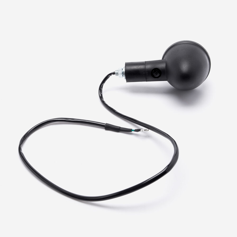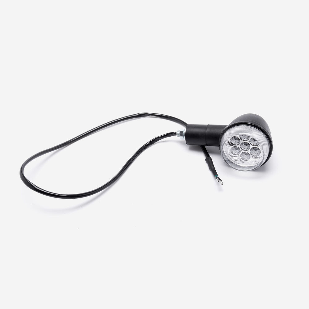 The indicator on a motorcycle is a signaling device used to communicate the rider's intent to turn or change lanes. It typically consists of a light that flashes to alert other road users. Mounted on the front and rear of the bike, indicators are essential for safety, helping to ensure that the rider's movements are clearly visible to others.