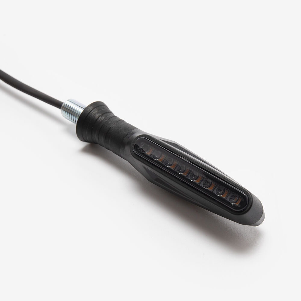 The indicator on a motorcycle is a signaling device used to communicate the rider's intent to turn or change lanes. It typically consists of a light that flashes to alert other road users. Mounted on the front and rear of the bike, indicators are essential for safety, helping to ensure that the rider's movements are clearly visible to others.