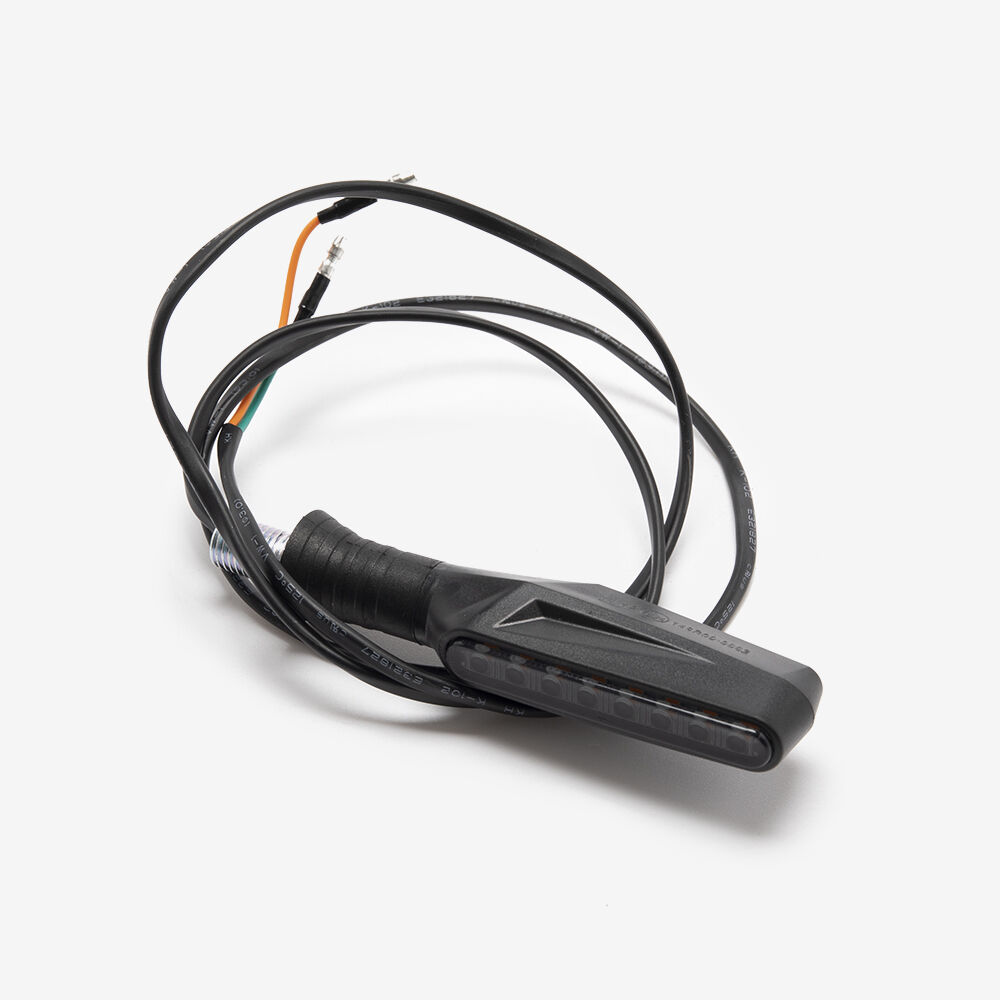 The indicator on a motorcycle is a signaling device used to communicate the rider's intent to turn or change lanes. It typically consists of a light that flashes to alert other road users. Mounted on the front and rear of the bike, indicators are essential for safety, helping to ensure that the rider's movements are clearly visible to others.