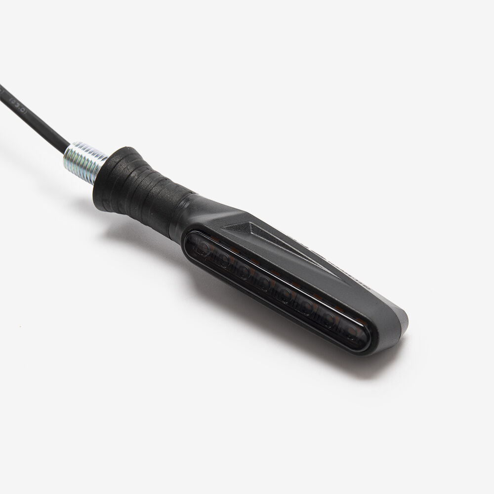 The indicator on a motorcycle is a signaling device used to communicate the rider's intent to turn or change lanes. It typically consists of a light that flashes to alert other road users. Mounted on the front and rear of the bike, indicators are essential for safety, helping to ensure that the rider's movements are clearly visible to others.
