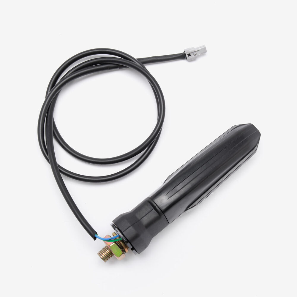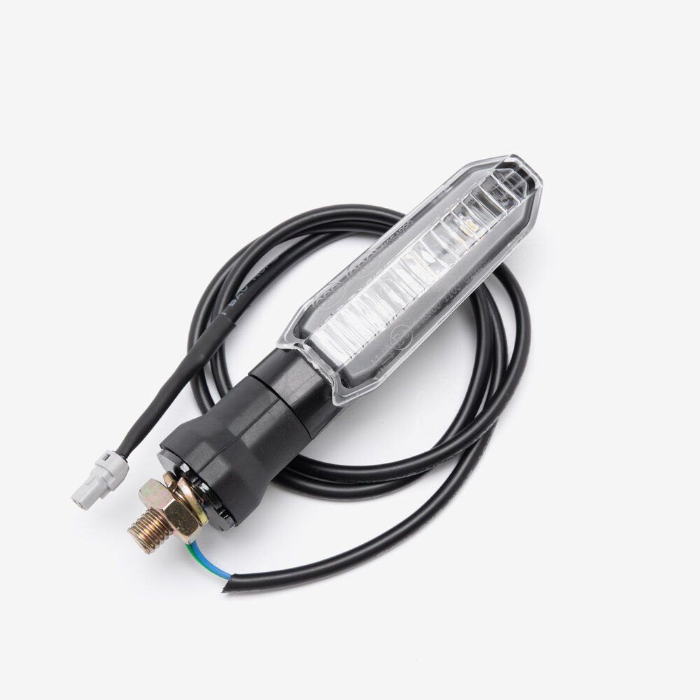 The indicator on a motorcycle is a signaling device used to communicate the rider's intent to turn or change lanes. It typically consists of a light that flashes to alert other road users. Mounted on the front and rear of the bike, indicators are essential for safety, helping to ensure that the rider's movements are clearly visible to others.