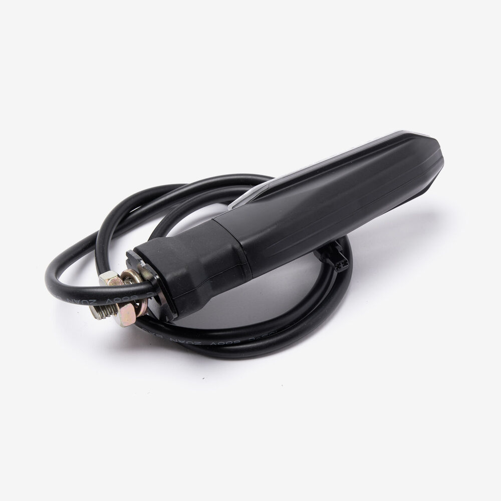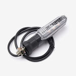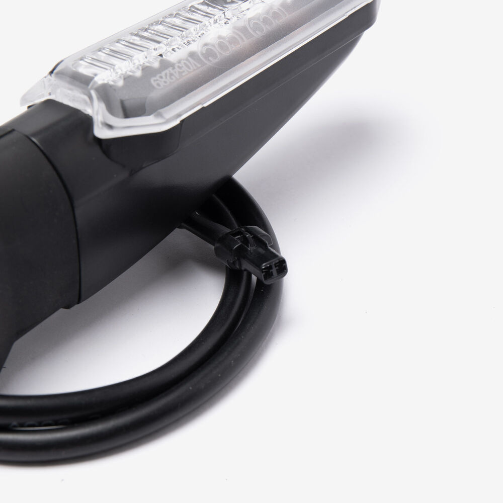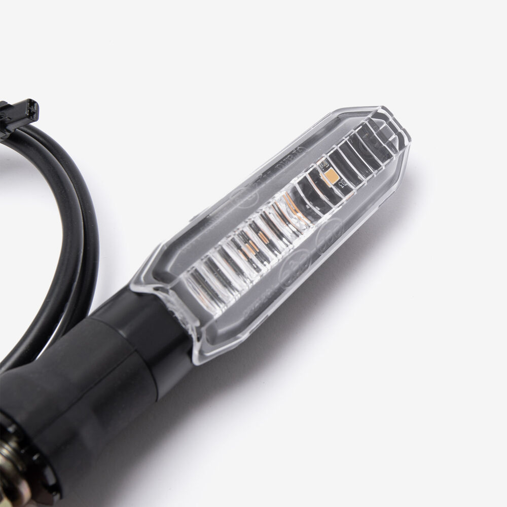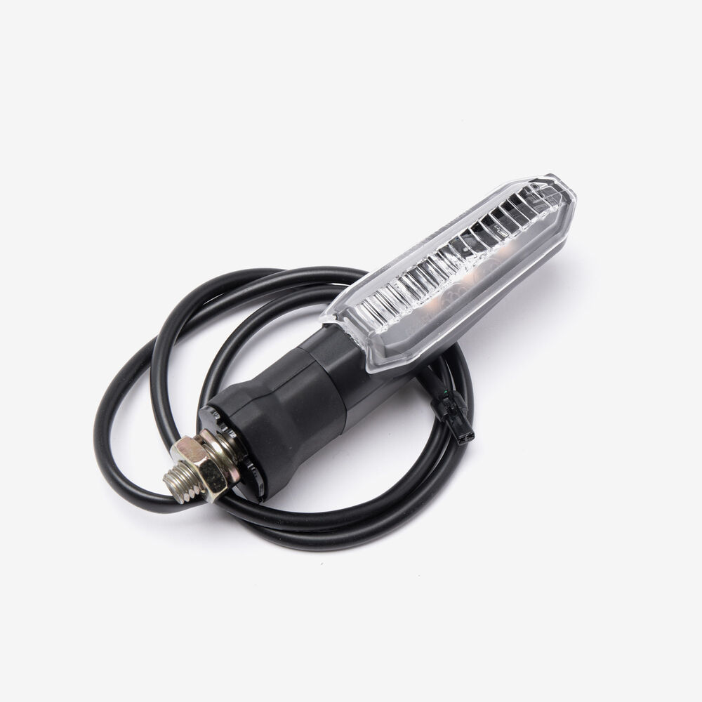 The indicator on a motorcycle is a signaling device used to communicate the rider's intent to turn or change lanes. It typically consists of a light that flashes to alert other road users. Mounted on the front and rear of the bike, indicators are essential for safety, helping to ensure that the rider's movements are clearly visible to others.