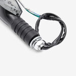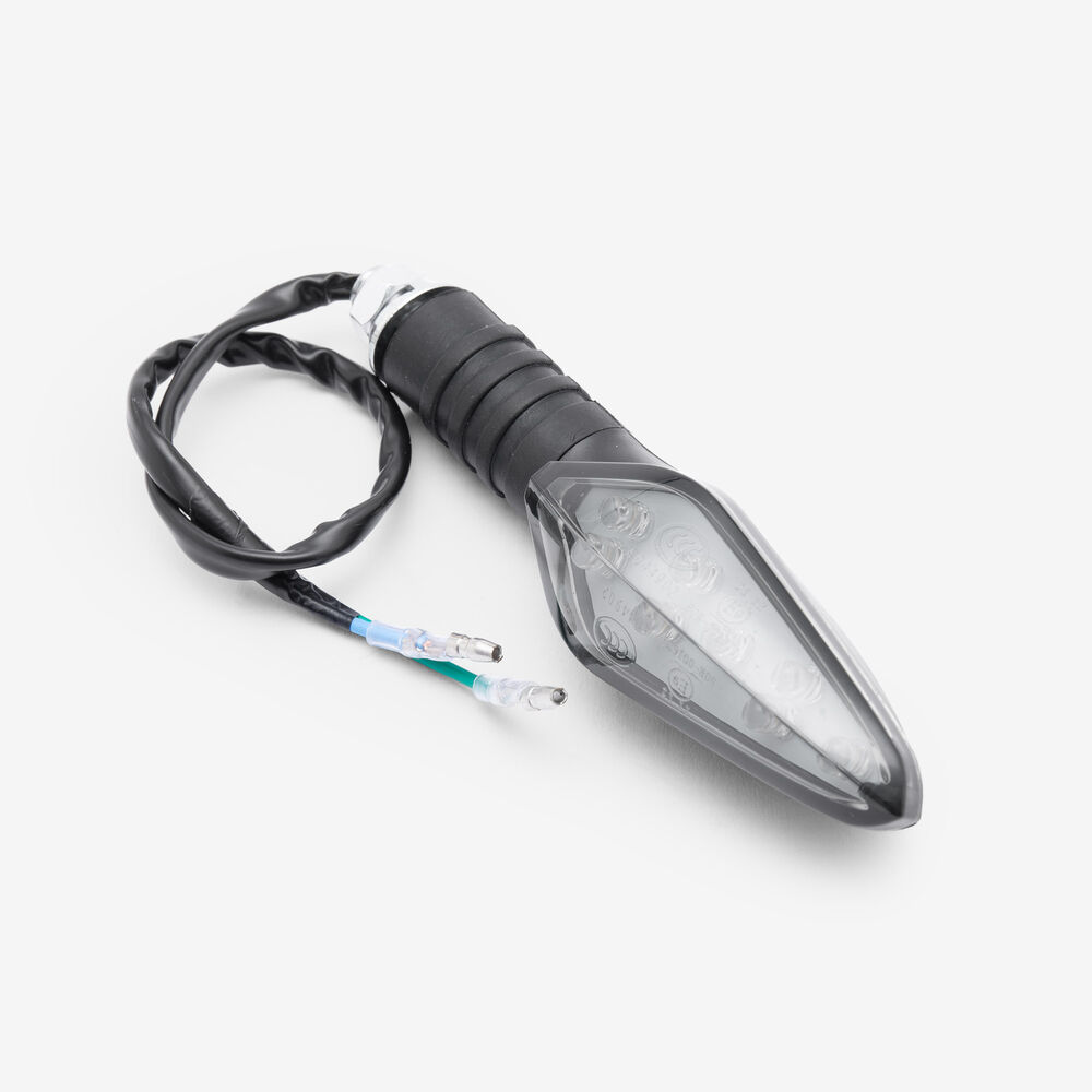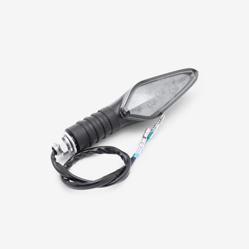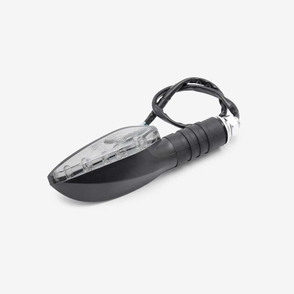 The indicator on a motorcycle is a signaling device used to communicate the rider's intent to turn or change lanes. It typically consists of a light that flashes to alert other road users. Mounted on the front and rear of the bike, indicators are essential for safety, helping to ensure that the rider's movements are clearly visible to others.