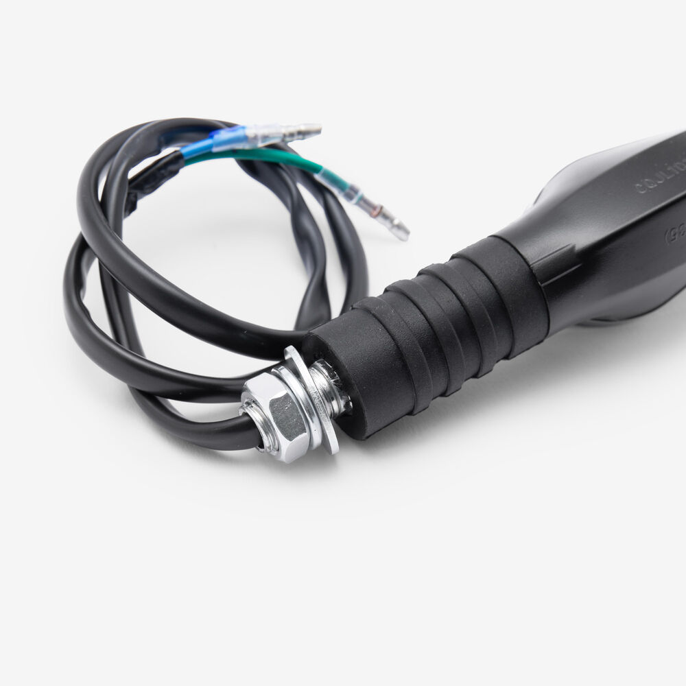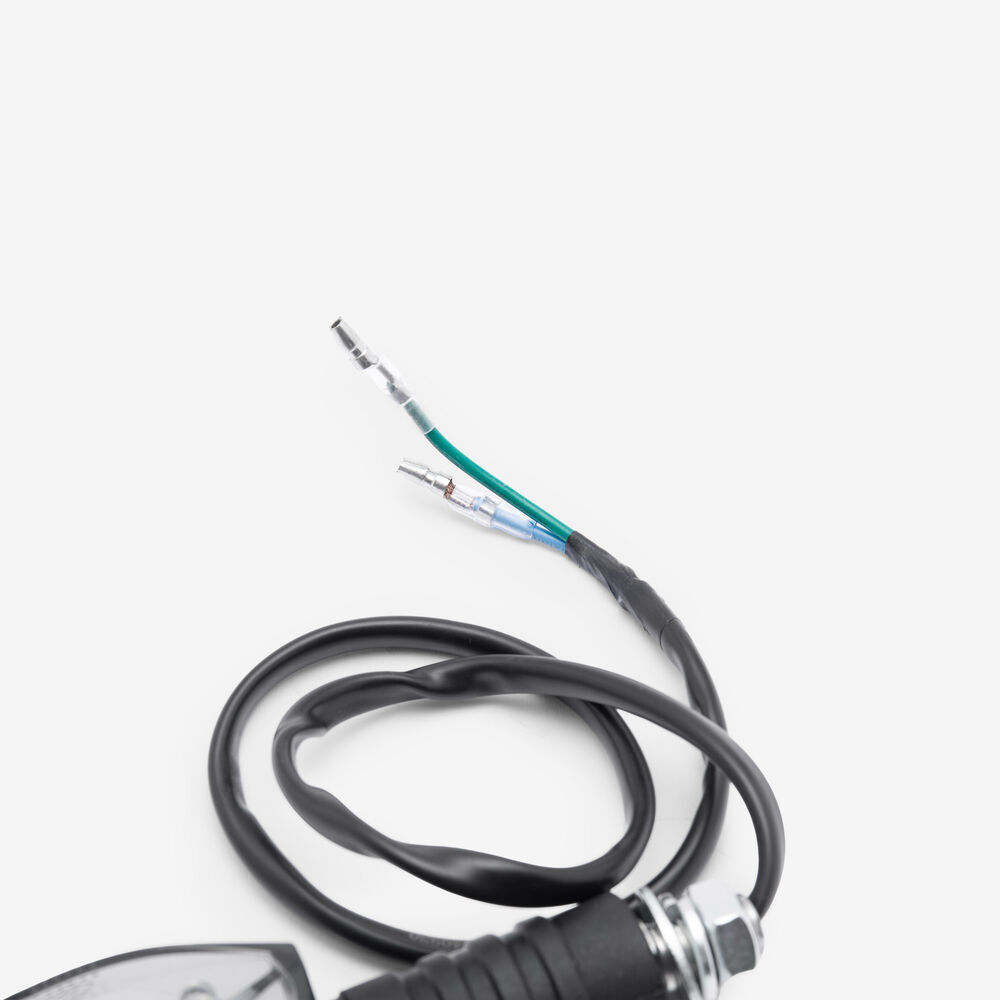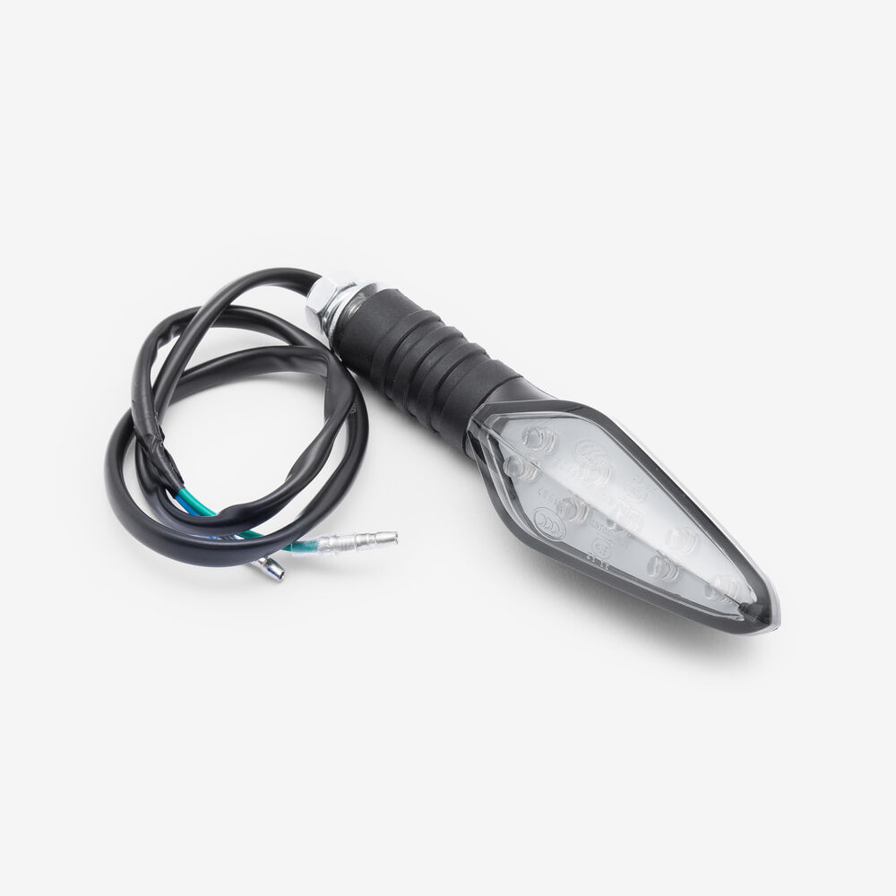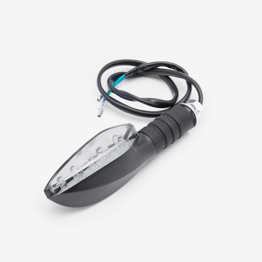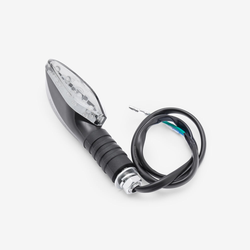 The indicator on a motorcycle is a signaling device used to communicate the rider's intent to turn or change lanes. It typically consists of a light that flashes to alert other road users. Mounted on the front and rear of the bike, indicators are essential for safety, helping to ensure that the rider's movements are clearly visible to others.