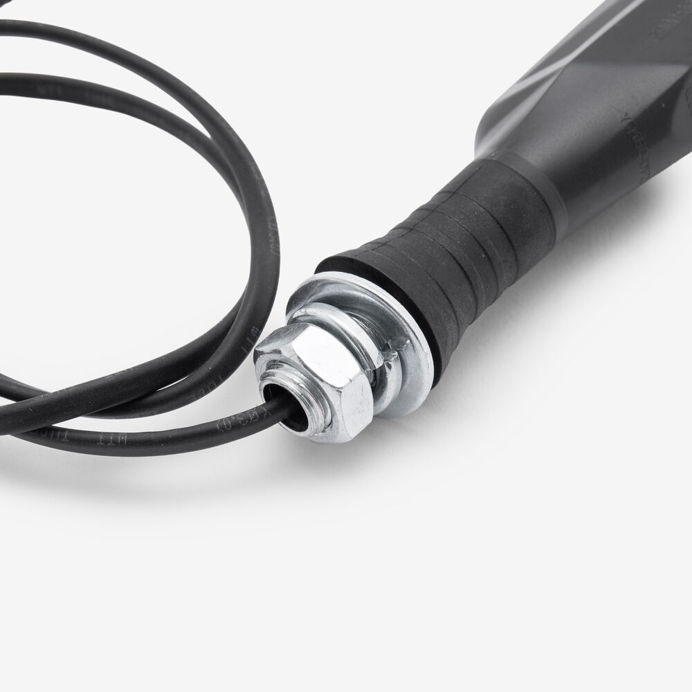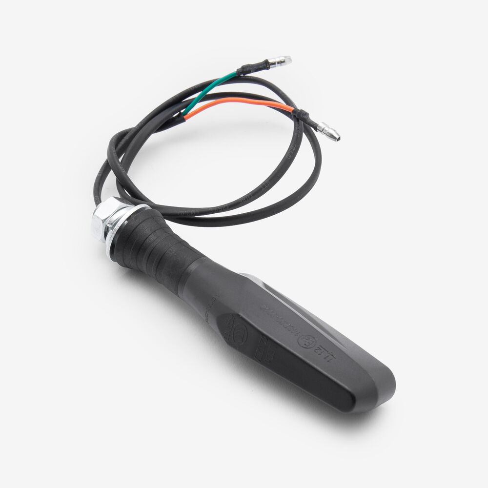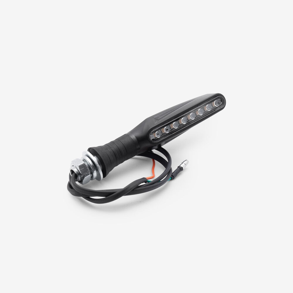 The indicator on a motorcycle is a signaling device used to communicate the rider's intent to turn or change lanes. It typically consists of a light that flashes to alert other road users. Mounted on the front and rear of the bike, indicators are essential for safety, helping to ensure that the rider's movements are clearly visible to others.