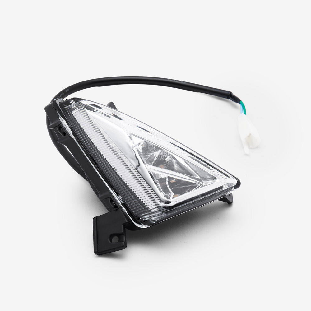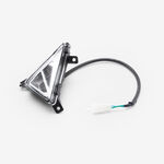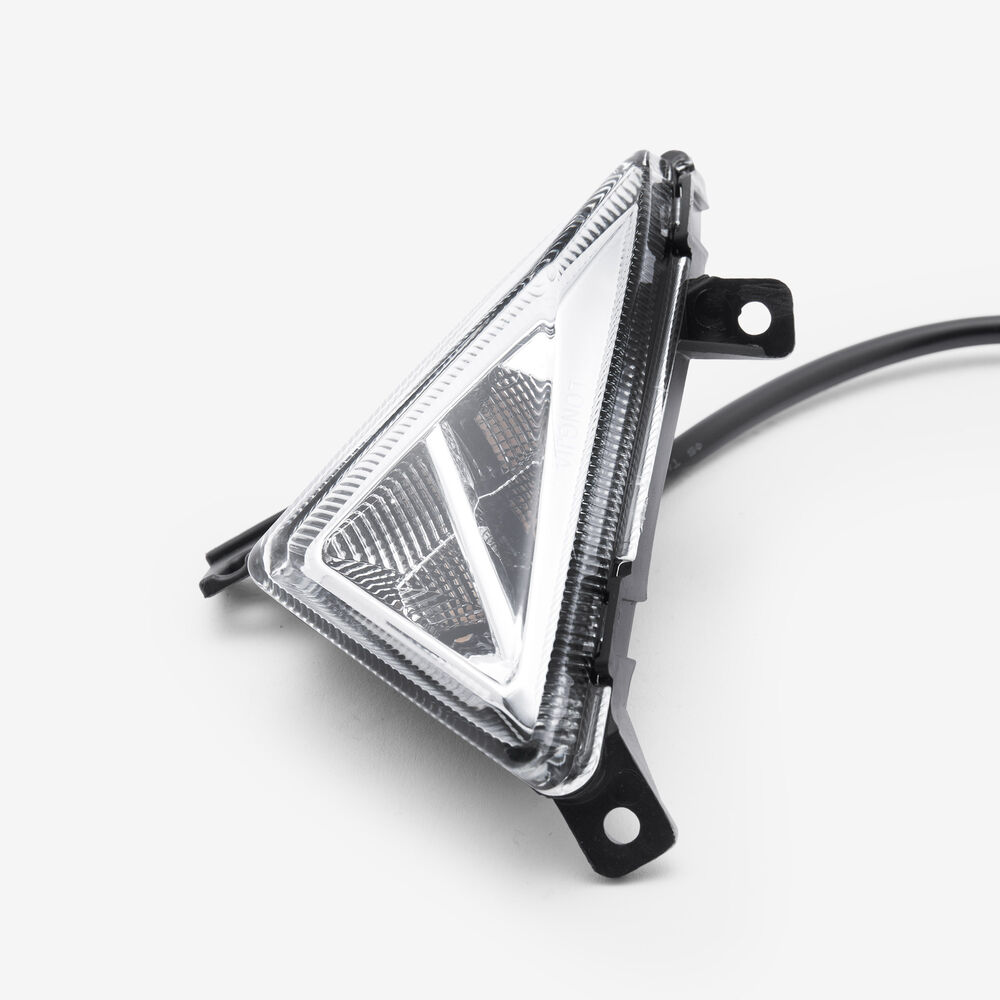 The indicator on a motorcycle is a signaling device used to communicate the rider's intent to turn or change lanes. It typically consists of a light that flashes to alert other road users. Mounted on the front and rear of the bike, indicators are essential for safety, helping to ensure that the rider's movements are clearly visible to others.