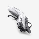 The indicator on a motorcycle is a signaling device used to communicate the rider's intent to turn or change lanes. It typically consists of a light that flashes to alert other road users. Mounted on the front and rear of the bike, indicators are essential for safety, helping to ensure that the rider's movements are clearly visible to others.