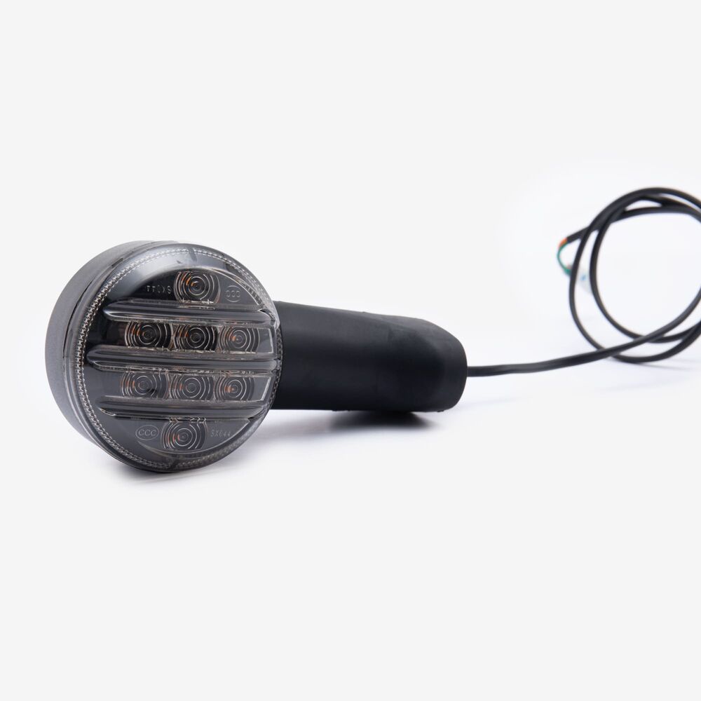 The indicator on a motorcycle is a signaling device used to communicate the rider's intent to turn or change lanes. It typically consists of a light that flashes to alert other road users. Mounted on the front and rear of the bike, indicators are essential for safety, helping to ensure that the rider's movements are clearly visible to others.
