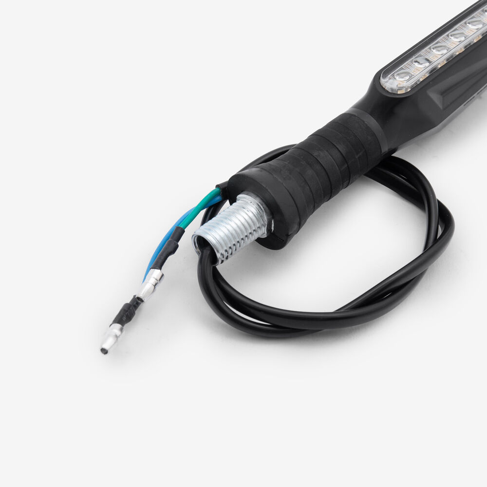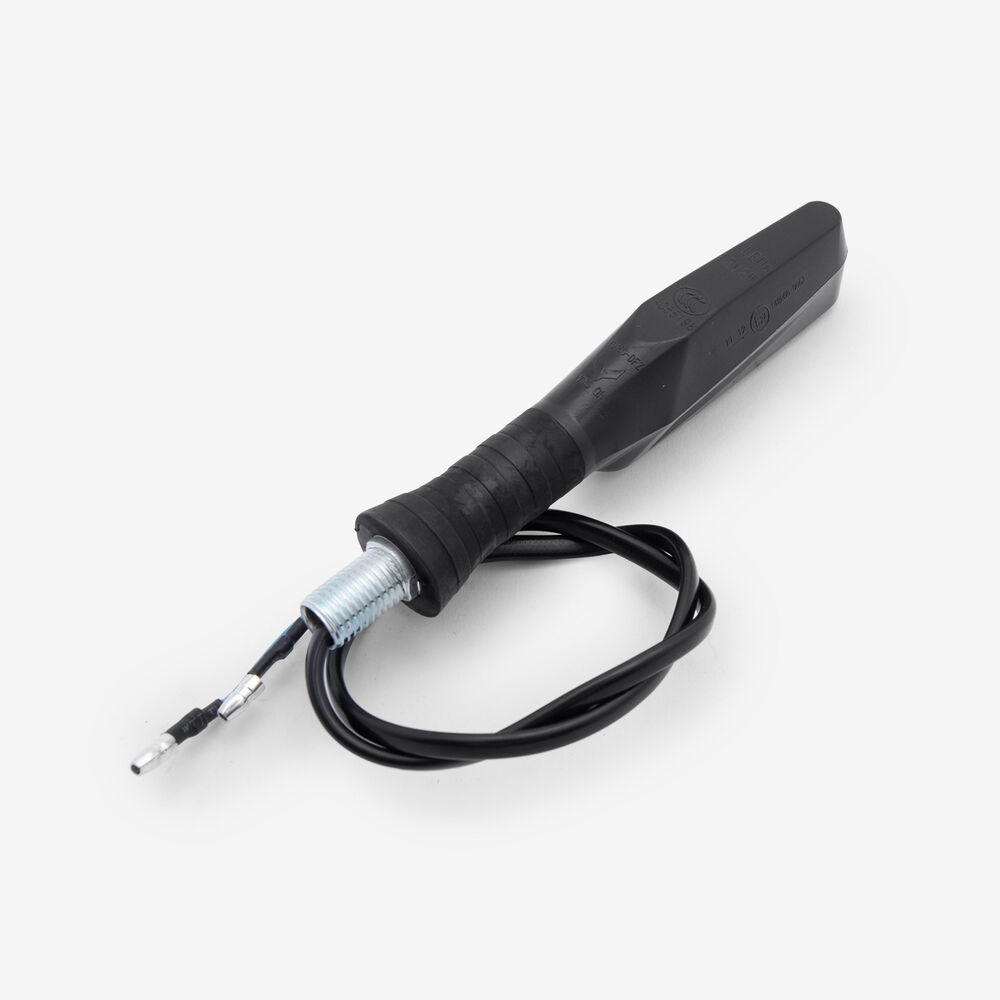 The indicator on a motorcycle is a signaling device used to communicate the rider's intent to turn or change lanes. It typically consists of a light that flashes to alert other road users. Mounted on the front and rear of the bike, indicators are essential for safety, helping to ensure that the rider's movements are clearly visible to others.