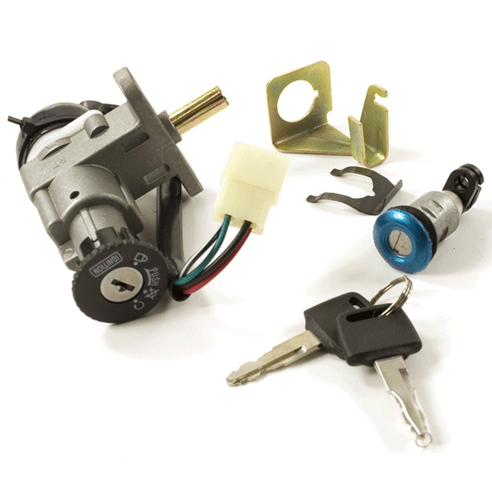 Lock sets on a motorcycle are collections of locking mechanisms designed to secure various parts of the bike, such as the ignition, steering, fuel cap, and storage compartments. These sets typically include a matching set of keys and are engineered to provide security and deter theft. They are constructed from durable materials to withstand tampering and environmental conditions, ensuring reliable protection for the motorcycle.