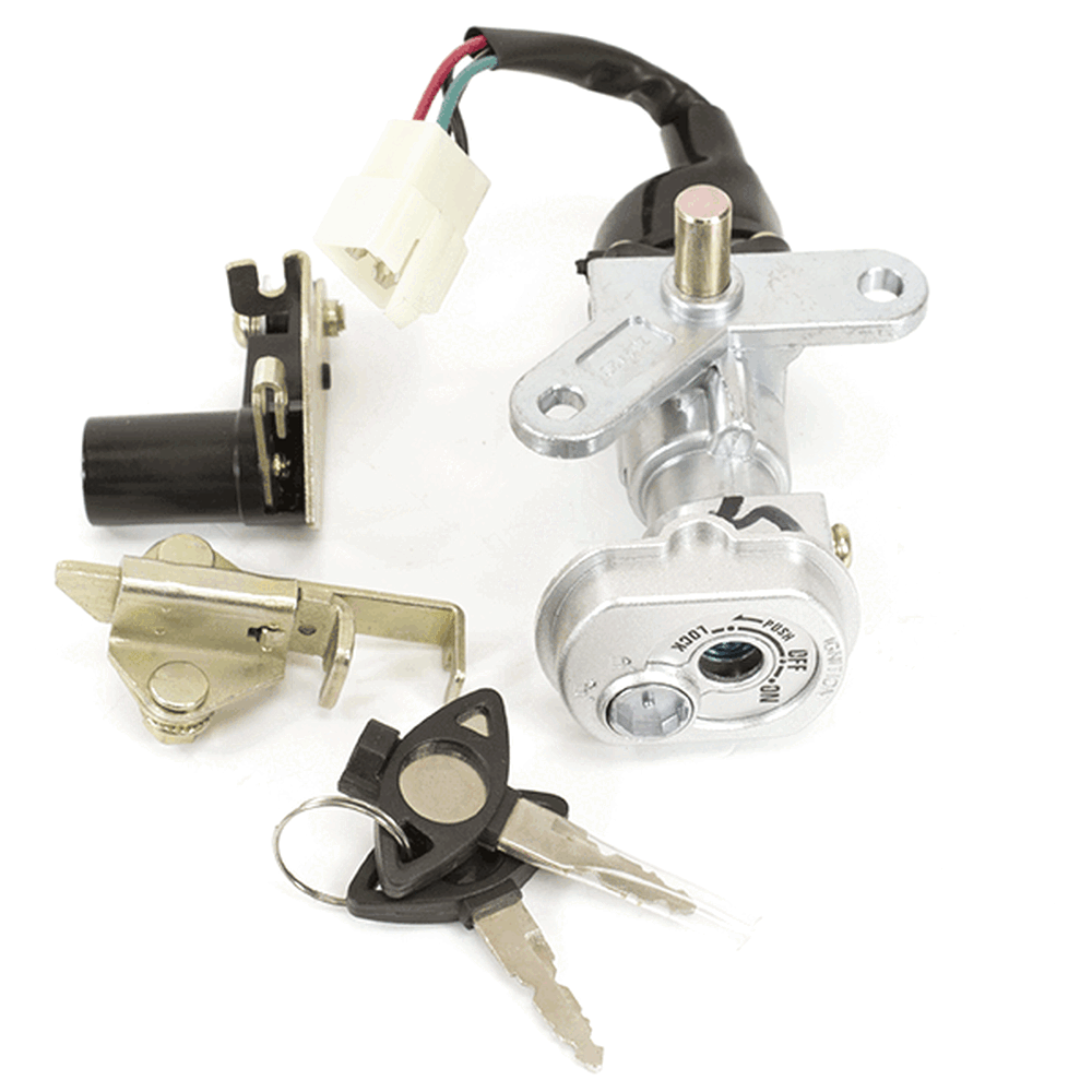 Lock sets on a motorcycle are collections of locking mechanisms designed to secure various parts of the bike, such as the ignition, steering, fuel cap, and storage compartments. These sets typically include a matching set of keys and are engineered to provide security and deter theft. They are constructed from durable materials to withstand tampering and environmental conditions, ensuring reliable protection for the motorcycle.