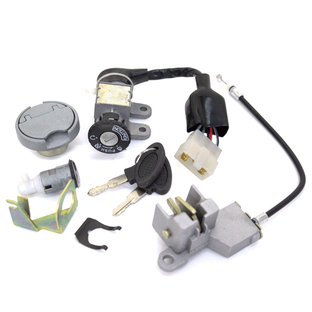 Lock sets on a motorcycle are collections of locking mechanisms designed to secure various parts of the bike, such as the ignition, steering, fuel cap, and storage compartments. These sets typically include a matching set of keys and are engineered to provide security and deter theft. They are constructed from durable materials to withstand tampering and environmental conditions, ensuring reliable protection for the motorcycle.