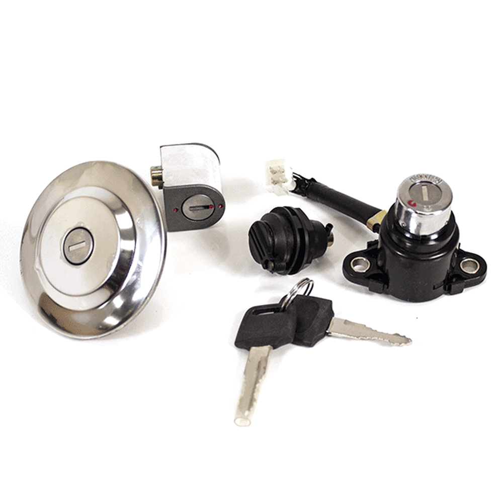 Lock sets on a motorcycle are collections of locking mechanisms designed to secure various parts of the bike, such as the ignition, steering, fuel cap, and storage compartments. These sets typically include a matching set of keys and are engineered to provide security and deter theft. They are constructed from durable materials to withstand tampering and environmental conditions, ensuring reliable protection for the motorcycle.