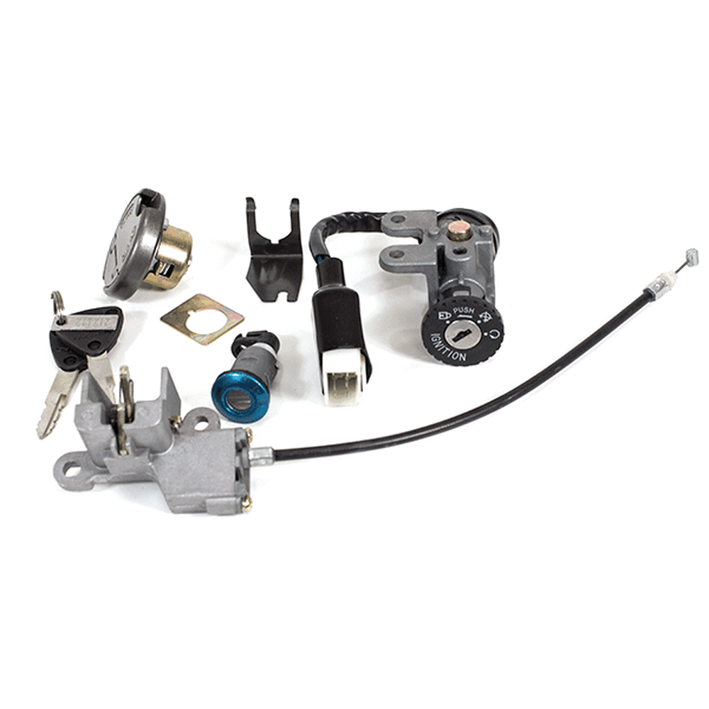 Lock sets on a motorcycle are collections of locking mechanisms designed to secure various parts of the bike, such as the ignition, steering, fuel cap, and storage compartments. These sets typically include a matching set of keys and are engineered to provide security and deter theft. They are constructed from durable materials to withstand tampering and environmental conditions, ensuring reliable protection for the motorcycle.