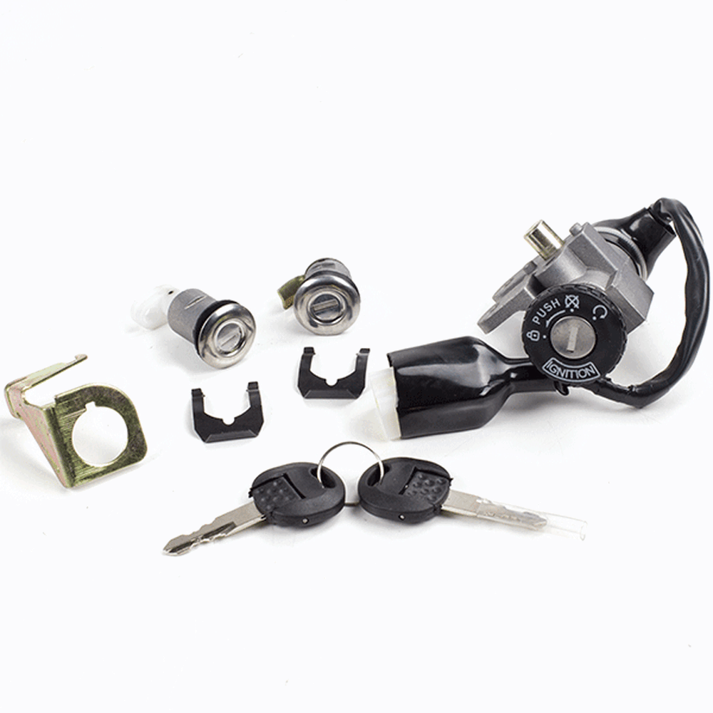 Lock sets on a motorcycle are collections of locking mechanisms designed to secure various parts of the bike, such as the ignition, steering, fuel cap, and storage compartments. These sets typically include a matching set of keys and are engineered to provide security and deter theft. They are constructed from durable materials to withstand tampering and environmental conditions, ensuring reliable protection for the motorcycle.