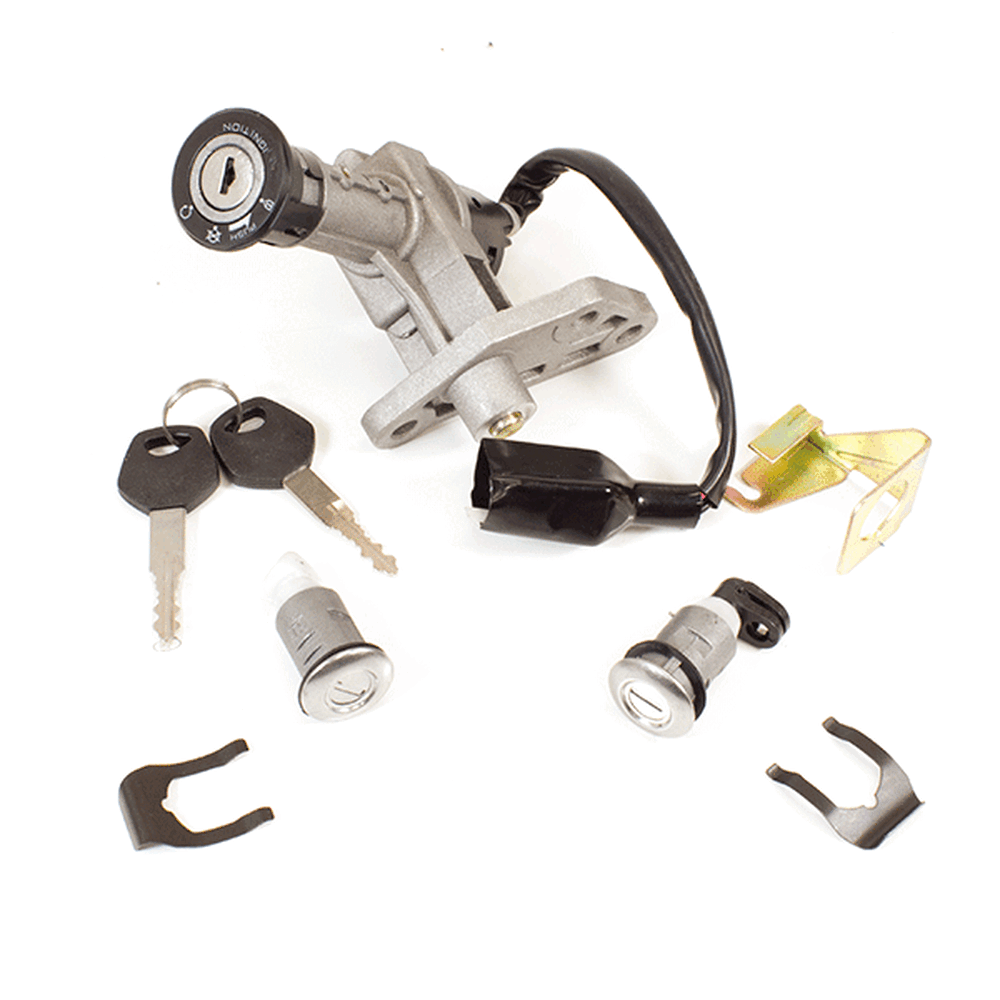 Lock sets on a motorcycle are collections of locking mechanisms designed to secure various parts of the bike, such as the ignition, steering, fuel cap, and storage compartments. These sets typically include a matching set of keys and are engineered to provide security and deter theft. They are constructed from durable materials to withstand tampering and environmental conditions, ensuring reliable protection for the motorcycle.