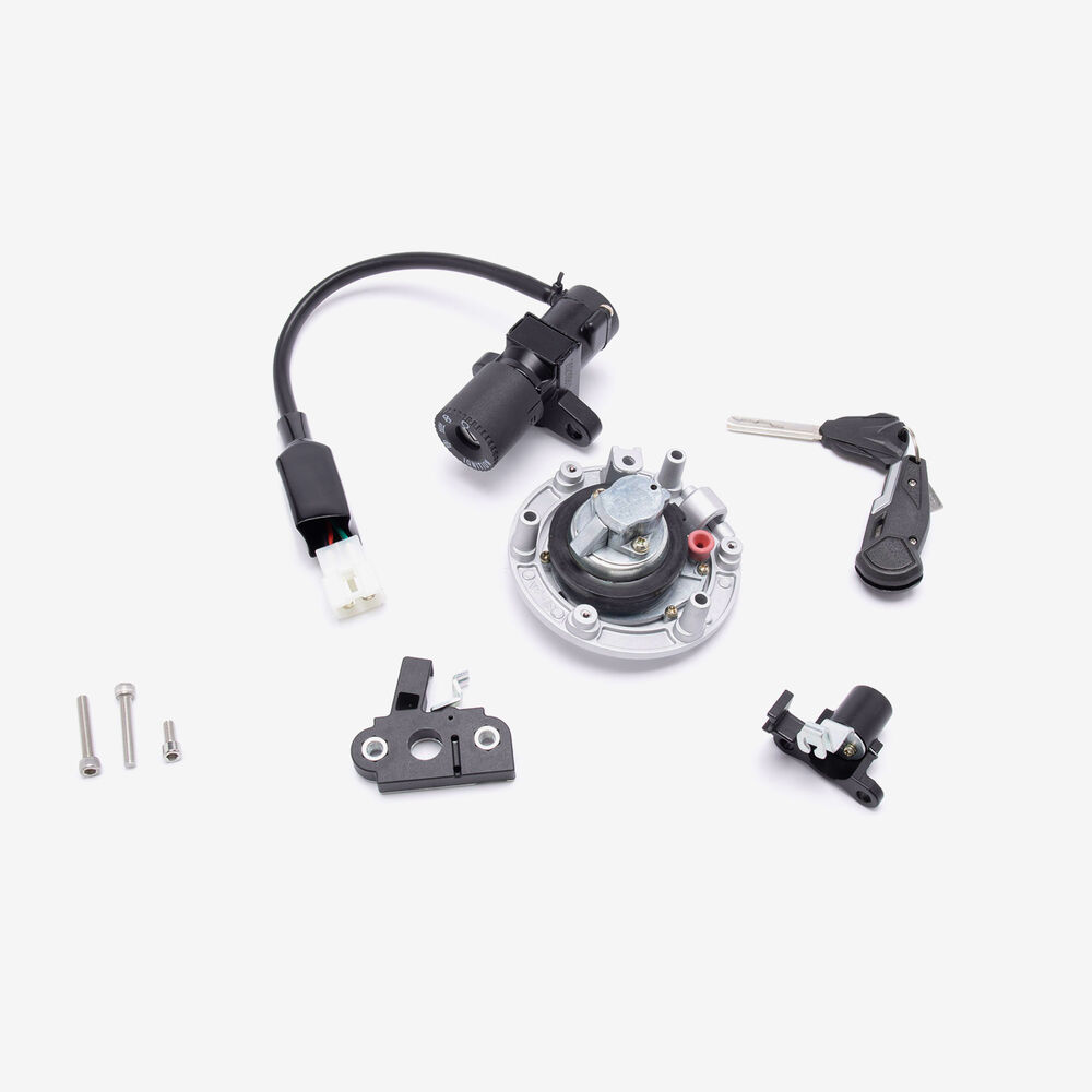 Lock sets on a motorcycle are collections of locking mechanisms designed to secure various parts of the bike, such as the ignition, steering, fuel cap, and storage compartments. These sets typically include a matching set of keys and are engineered to provide security and deter theft. They are constructed from durable materials to withstand tampering and environmental conditions, ensuring reliable protection for the motorcycle.
