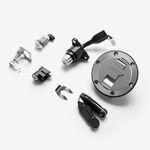 Lock sets on a motorcycle are collections of locking mechanisms designed to secure various parts of the bike, such as the ignition, steering, fuel cap, and storage compartments. These sets typically include a matching set of keys and are engineered to provide security and deter theft. They are constructed from durable materials to withstand tampering and environmental conditions, ensuring reliable protection for the motorcycle.