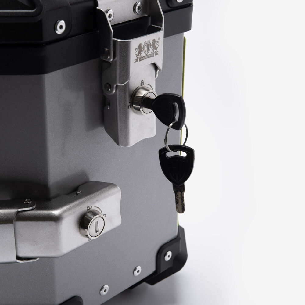 A luggage box on a motorcycle is a storage container used to carry personal items and gear securely. It is typically mounted on the rear or sides of the bike and offers a convenient and weatherproof solution for transporting belongings. Luggage boxes can be made from various materials such as plastic, metal, or fiberglass, and are designed to provide easy access and protection from the elements.