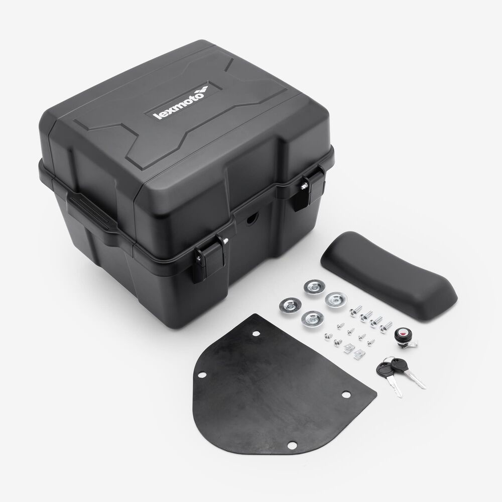 A luggage box lid on a motorcycle is the top cover of the luggage box or top case, designed to protect the contents inside. It is typically made from durable materials such as plastic, fiberglass, or aluminum to withstand impacts, weather, and wear. The lid usually features a locking mechanism to secure the box and prevent it from opening during rides. It may also have a weather-resistant seal to help keep items dry and free from dust or moisture.