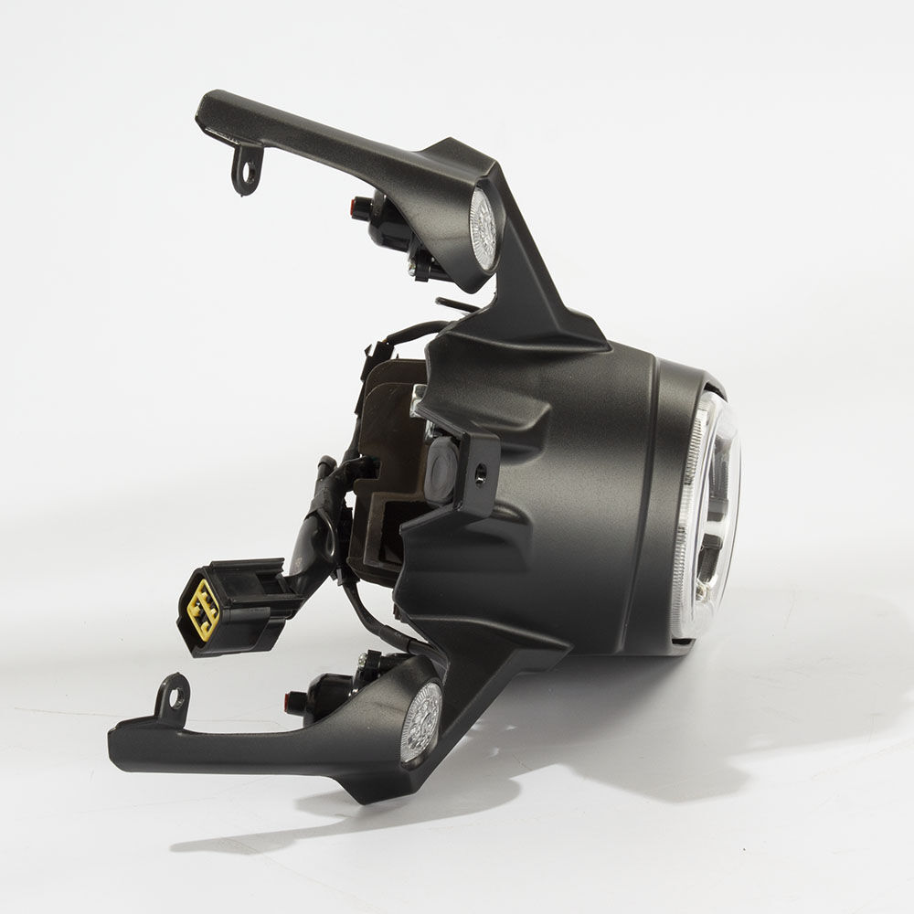 The headlight on a motorcycle is a primary lighting component mounted at the front of the bike to illuminate the road ahead. It enhances visibility during low-light conditions and improves safety by allowing the rider to see and be seen by others. Headlights typically use halogen, HID, or LED technology and are designed to withstand vibrations and weather conditions.