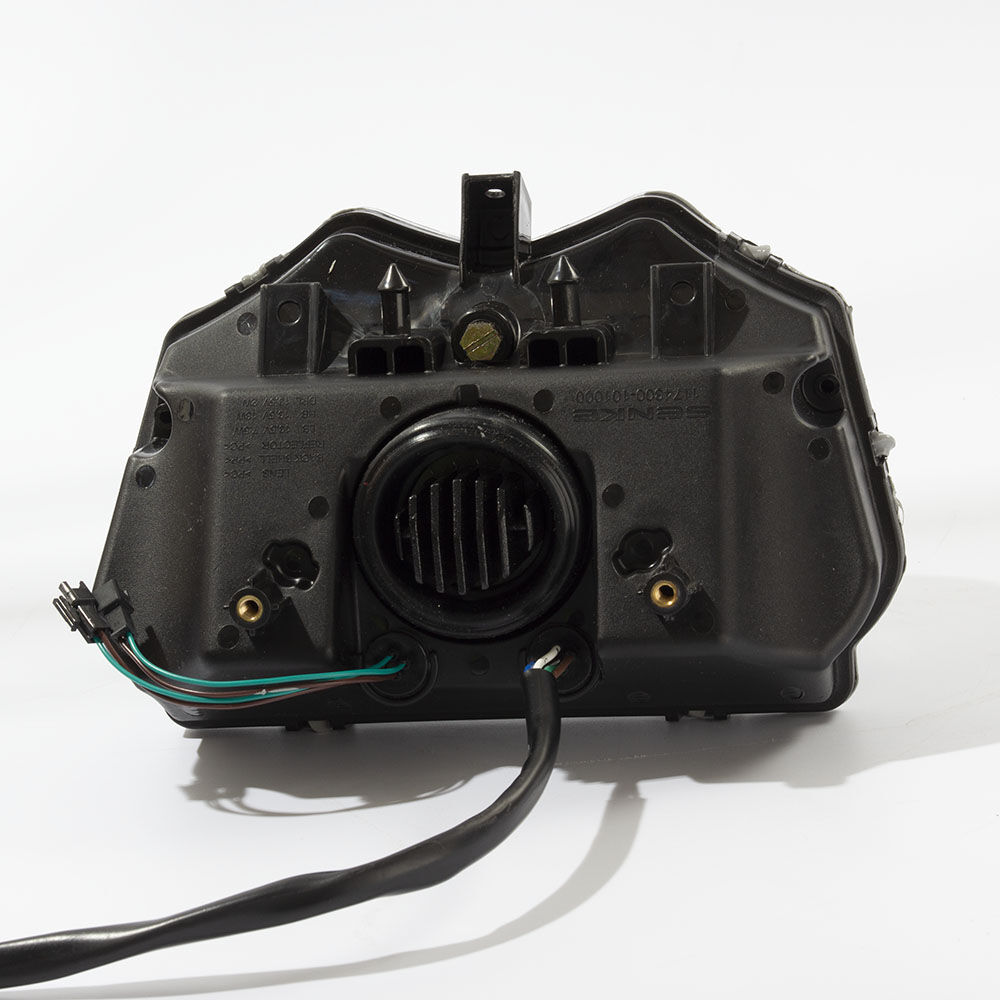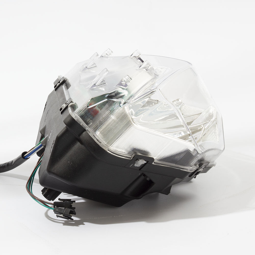 The headlight on a motorcycle is a primary lighting component mounted at the front of the bike to illuminate the road ahead. It enhances visibility during low-light conditions and improves safety by allowing the rider to see and be seen by others. Headlights typically use halogen, HID, or LED technology and are designed to withstand vibrations and weather conditions.