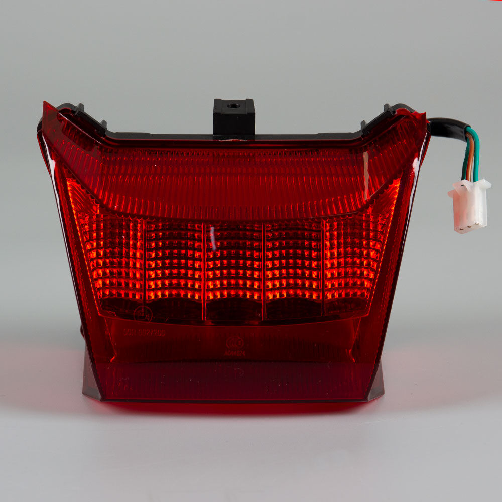 The tail light on a motorcycle is a rear-mounted light that signals the presence and braking actions of the rider to other drivers. It enhances visibility and safety by illuminating the rear of the motorcycle. Typically featuring LED or bulb lighting, the tail light is designed for durability and effective illumination in various riding conditions.