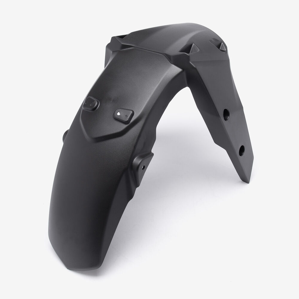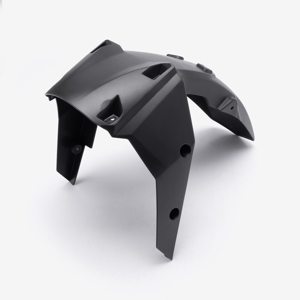 The front mudguard on a motorcycle is a panel mounted above the front wheel to protect the bike and rider from mud, water, and debris. It helps keep the front of the motorcycle cleaner and enhances rider safety by reducing the amount of spray. Made from materials like plastic or metal, the front mudguard is designed to endure road conditions and impacts.
