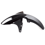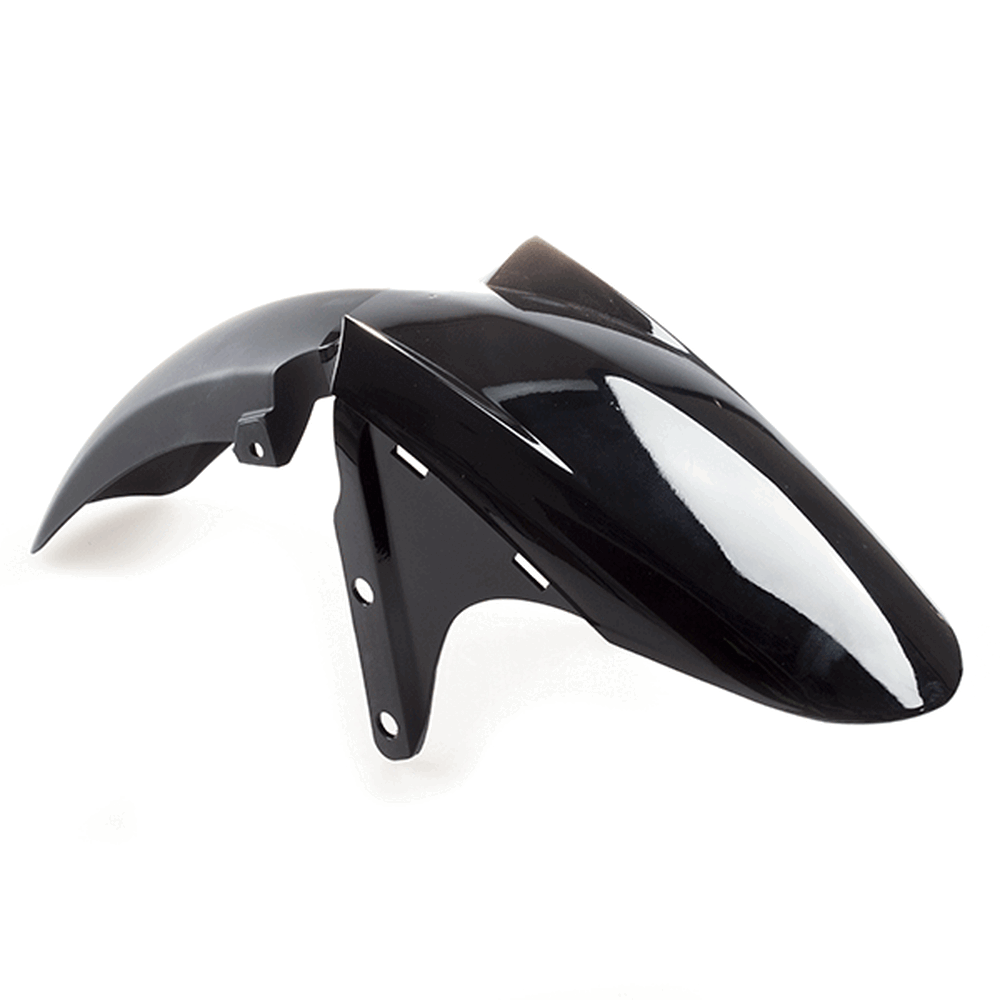 The front mudguard on a motorcycle is a panel mounted above the front wheel to protect the bike and rider from mud, water, and debris. It helps keep the front of the motorcycle cleaner and enhances rider safety by reducing the amount of spray. Made from materials like plastic or metal, the front mudguard is designed to endure road conditions and impacts.