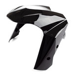 The front mudguard on a motorcycle is a panel mounted above the front wheel to protect the bike and rider from mud, water, and debris. It helps keep the front of the motorcycle cleaner and enhances rider safety by reducing the amount of spray. Made from materials like plastic or metal, the front mudguard is designed to endure road conditions and impacts.