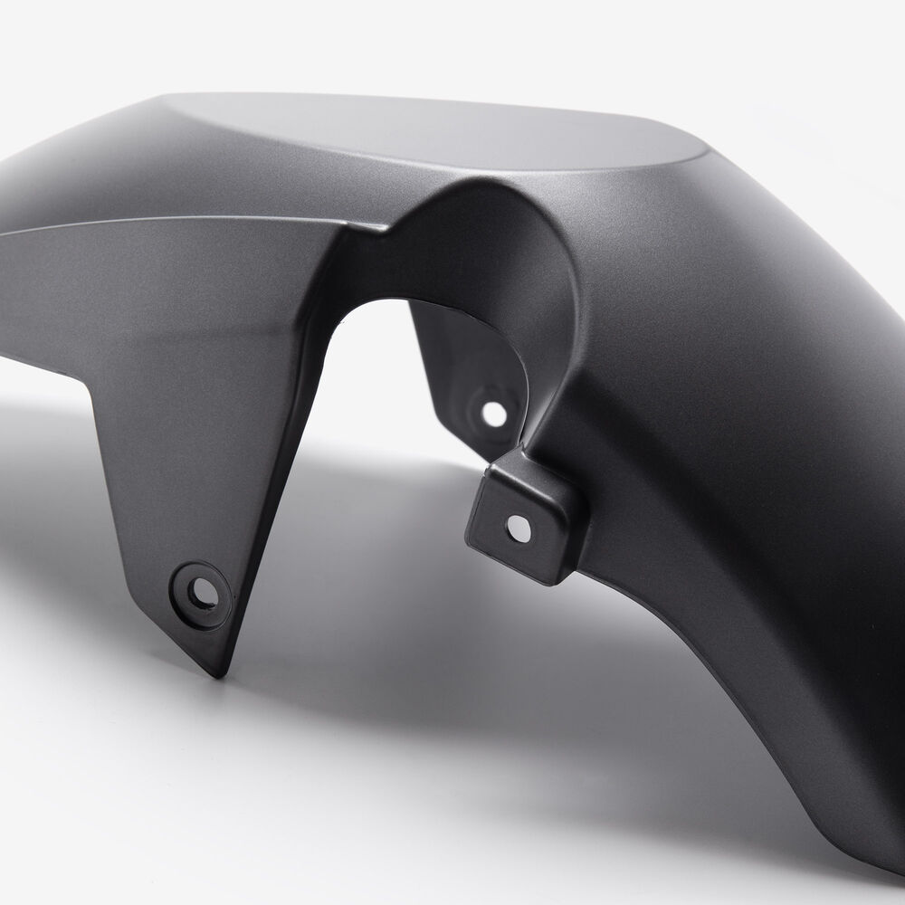 The front mudguard on a motorcycle is a panel mounted above the front wheel to protect the bike and rider from mud, water, and debris. It helps keep the front of the motorcycle cleaner and enhances rider safety by reducing the amount of spray. Made from materials like plastic or metal, the front mudguard is designed to endure road conditions and impacts.