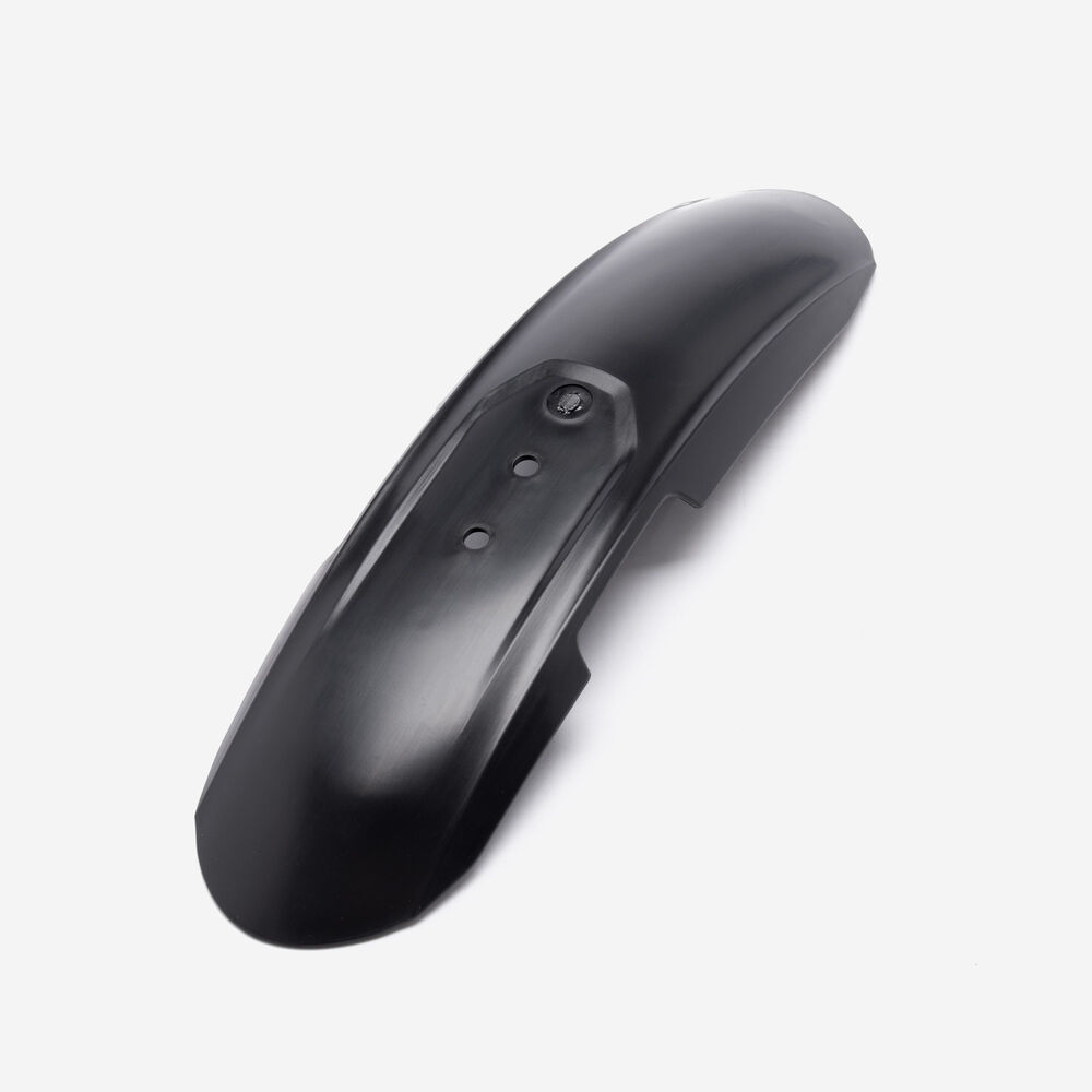 The front mudguard on a motorcycle is a panel mounted above the front wheel to protect the bike and rider from mud, water, and debris. It helps keep the front of the motorcycle cleaner and enhances rider safety by reducing the amount of spray. Made from materials like plastic or metal, the front mudguard is designed to endure road conditions and impacts.