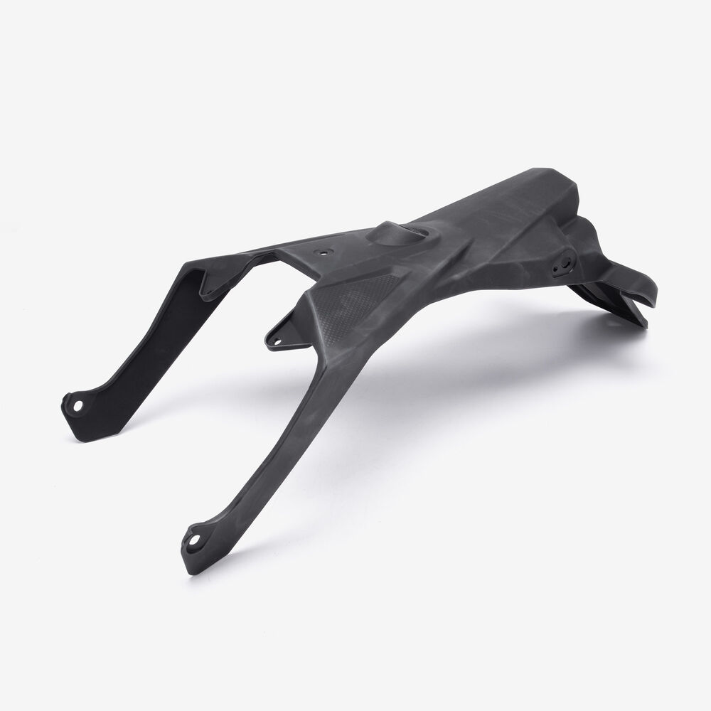 The rear mudguard on a motorcycle is a protective panel mounted above the rear wheel to shield the bike and rider from water, mud, and debris kicked up by the tire. It helps keep the rear of the motorcycle cleaner and improves visibility by preventing splashes.