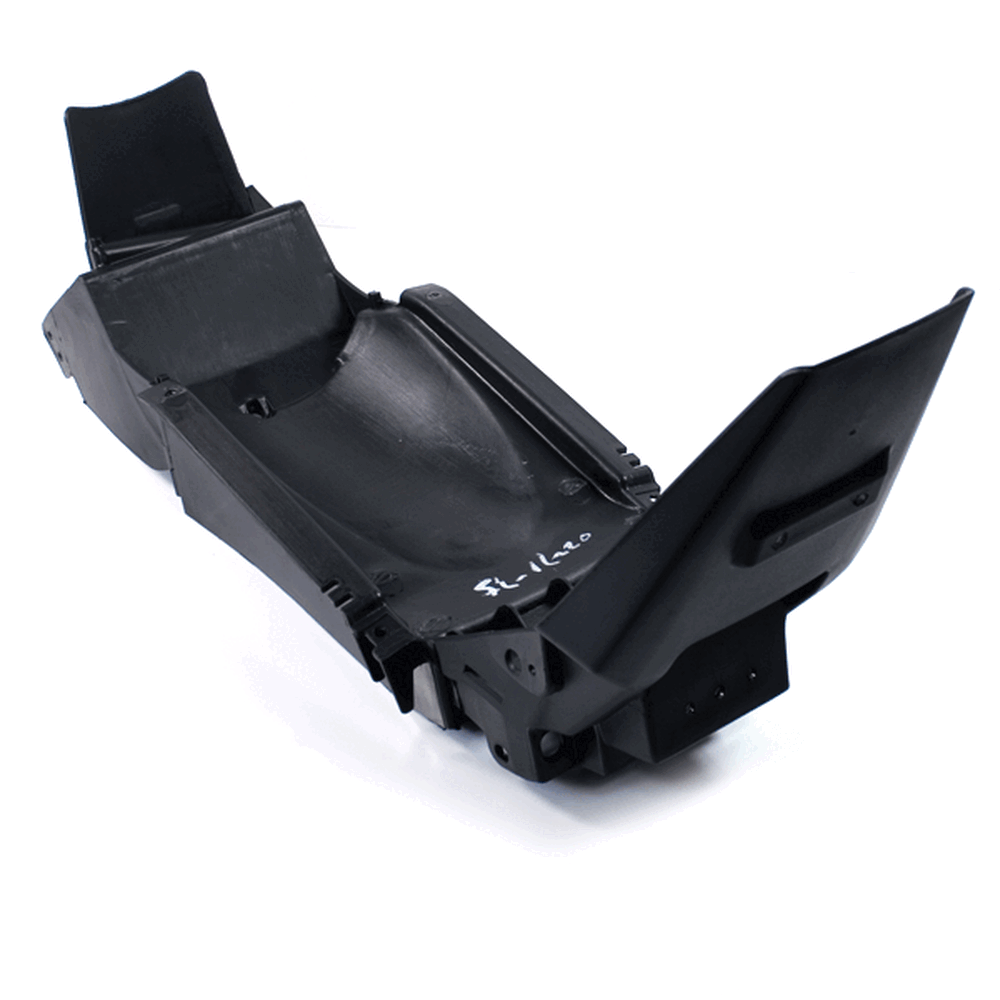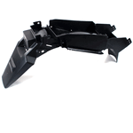 The rear mudguard on a motorcycle is a protective panel mounted above the rear wheel to shield the bike and rider from water, mud, and debris kicked up by the tire. It helps keep the rear of the motorcycle cleaner and improves visibility by preventing splashes.