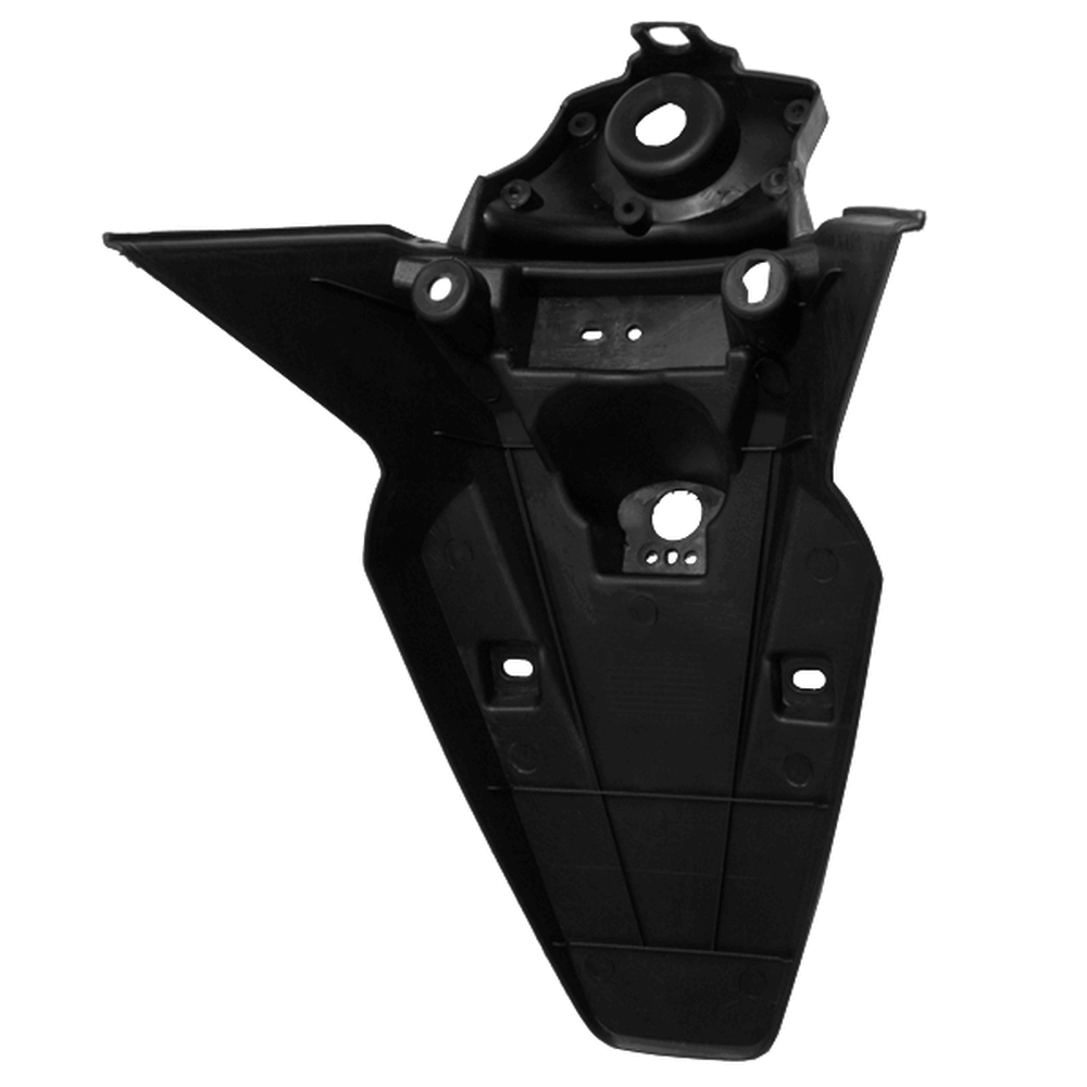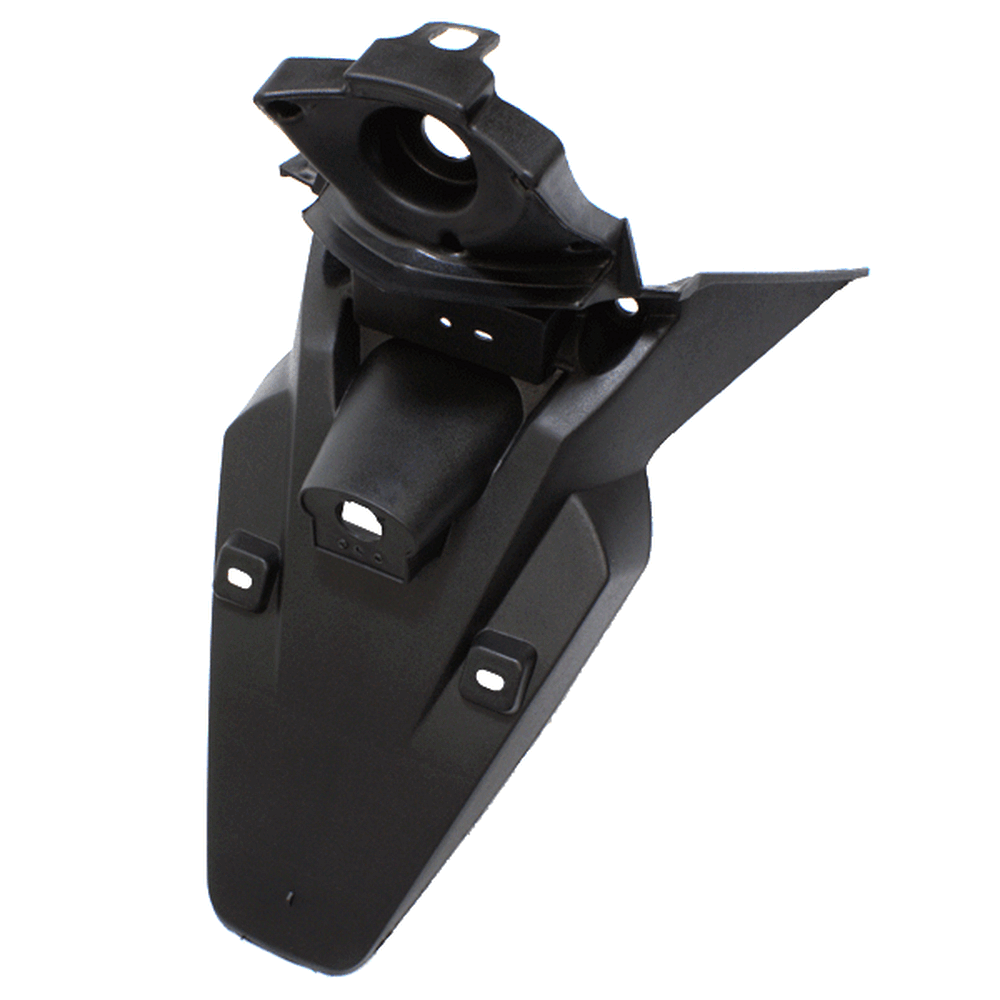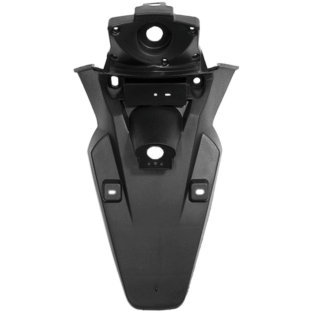 The rear mudguard on a motorcycle is a protective panel mounted above the rear wheel to shield the bike and rider from water, mud, and debris kicked up by the tire. It helps keep the rear of the motorcycle cleaner and improves visibility by preventing splashes.