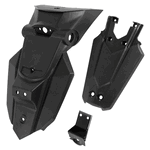 The rear mudguard on a motorcycle is a protective panel mounted above the rear wheel to shield the bike and rider from water, mud, and debris kicked up by the tire. It helps keep the rear of the motorcycle cleaner and improves visibility by preventing splashes.