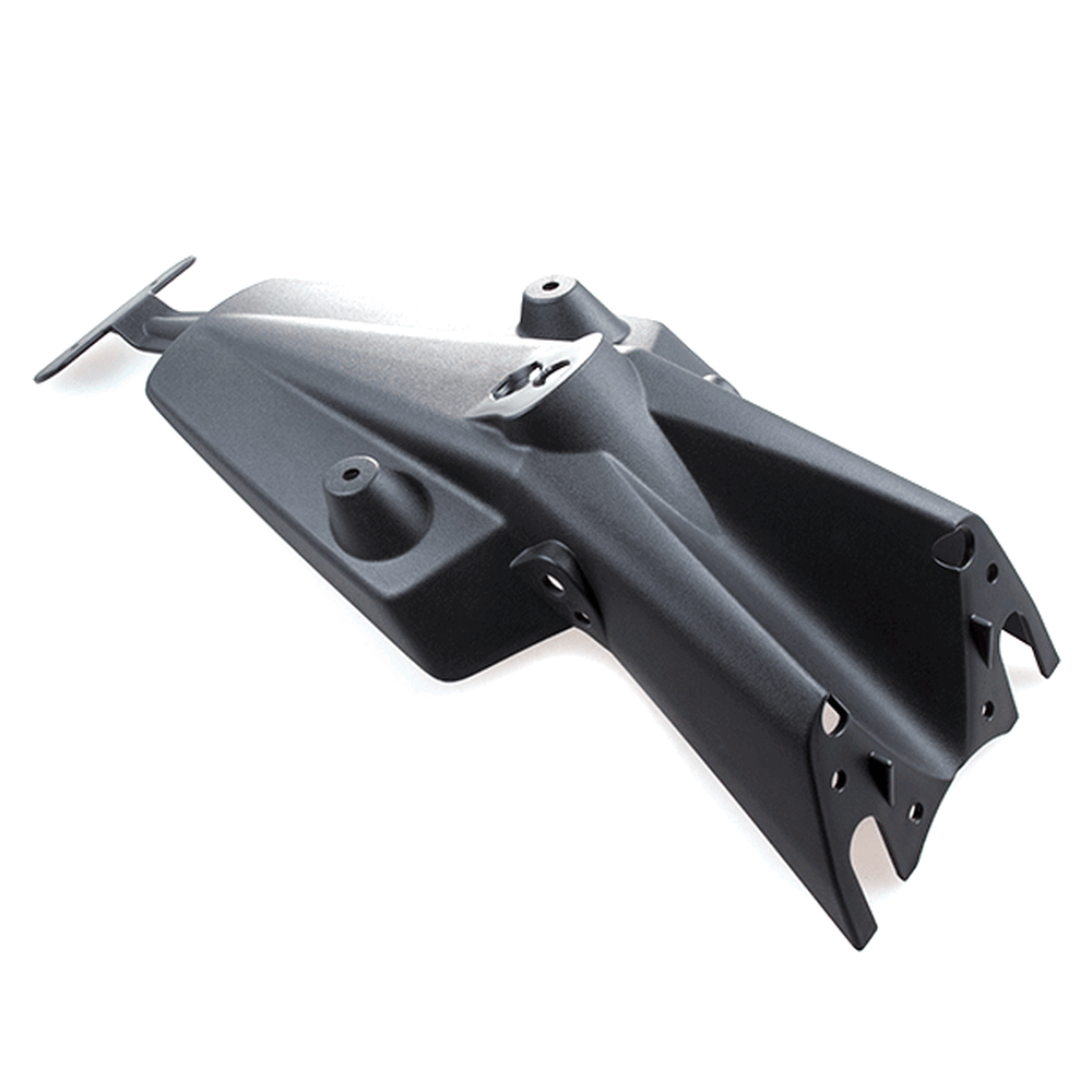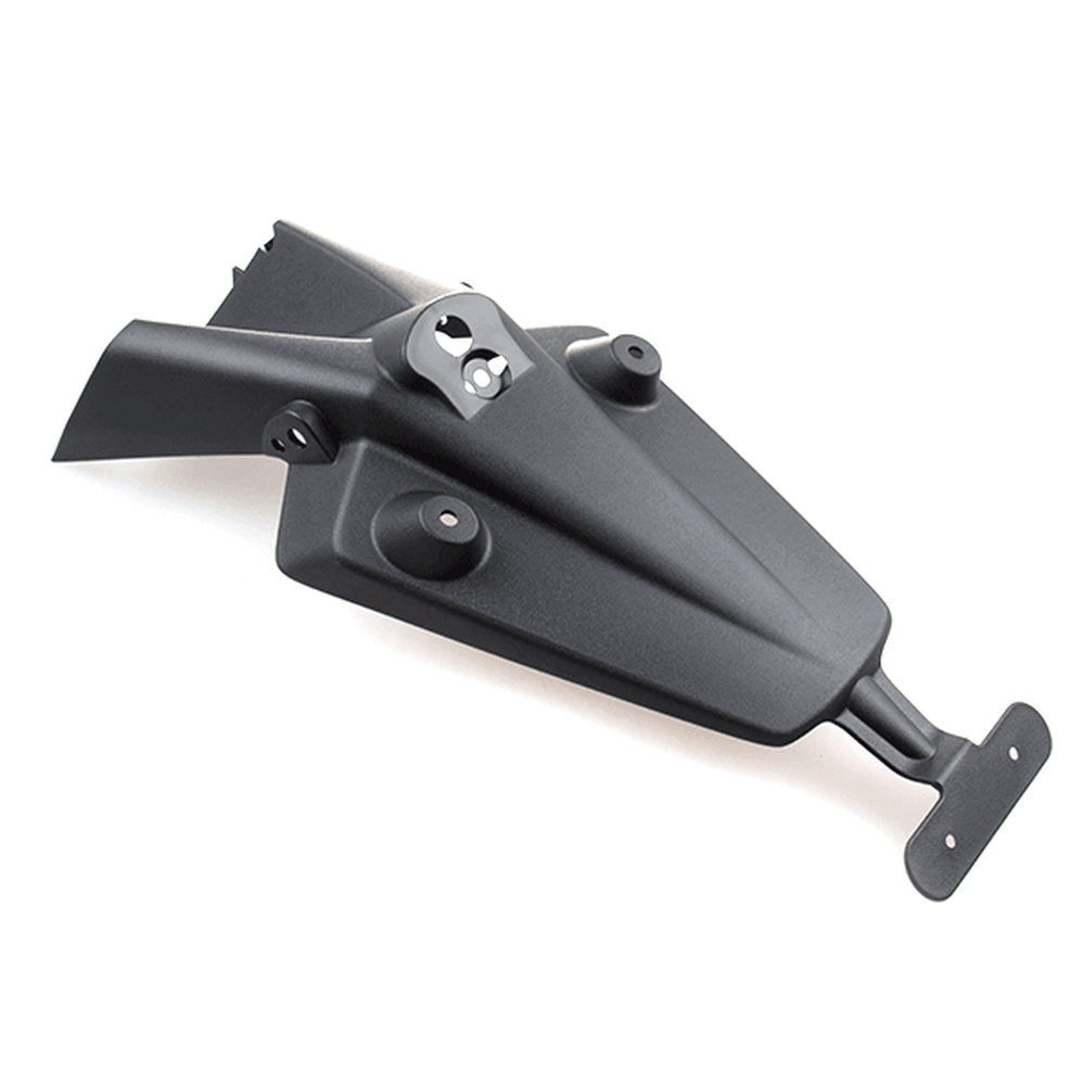 The rear mudguard on a motorcycle is a protective panel mounted above the rear wheel to shield the bike and rider from water, mud, and debris kicked up by the tire. It helps keep the rear of the motorcycle cleaner and improves visibility by preventing splashes.