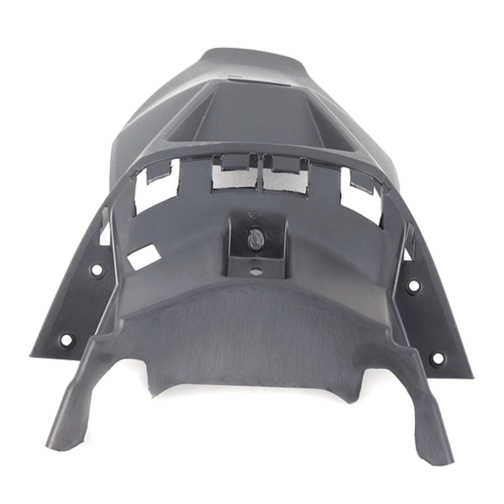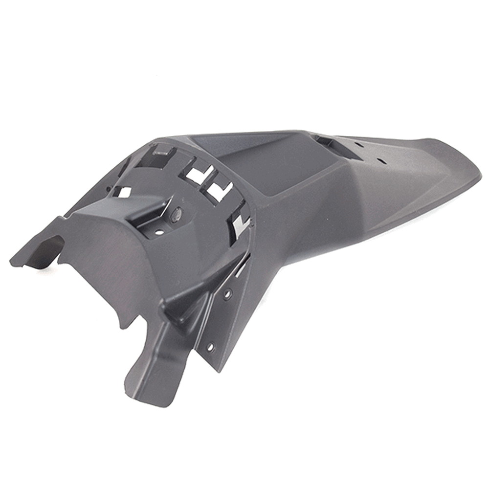 The rear mudguard on a motorcycle is a protective panel mounted above the rear wheel to shield the bike and rider from water, mud, and debris kicked up by the tire. It helps keep the rear of the motorcycle cleaner and improves visibility by preventing splashes.