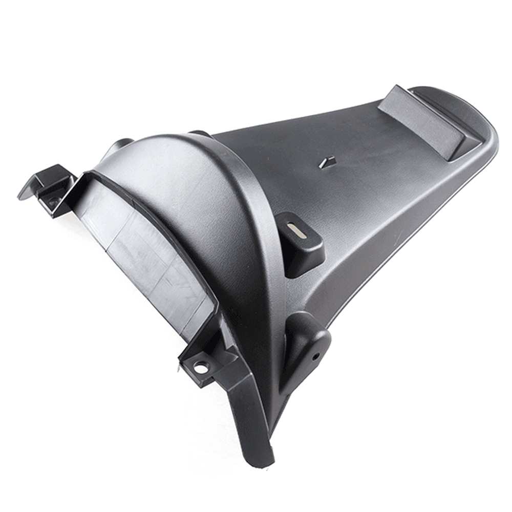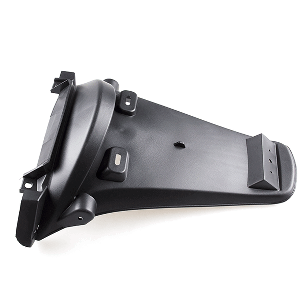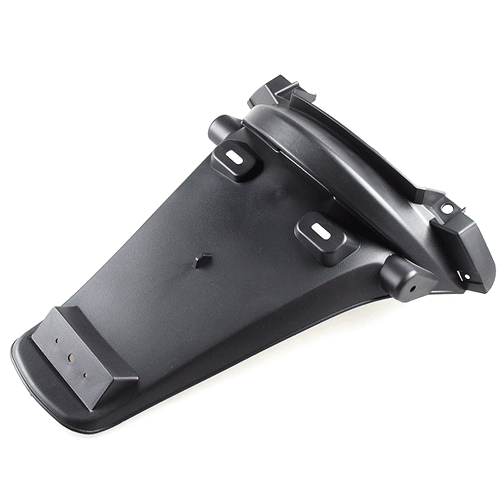 The rear mudguard on a motorcycle is a protective panel mounted above the rear wheel to shield the bike and rider from water, mud, and debris kicked up by the tire. It helps keep the rear of the motorcycle cleaner and improves visibility by preventing splashes.