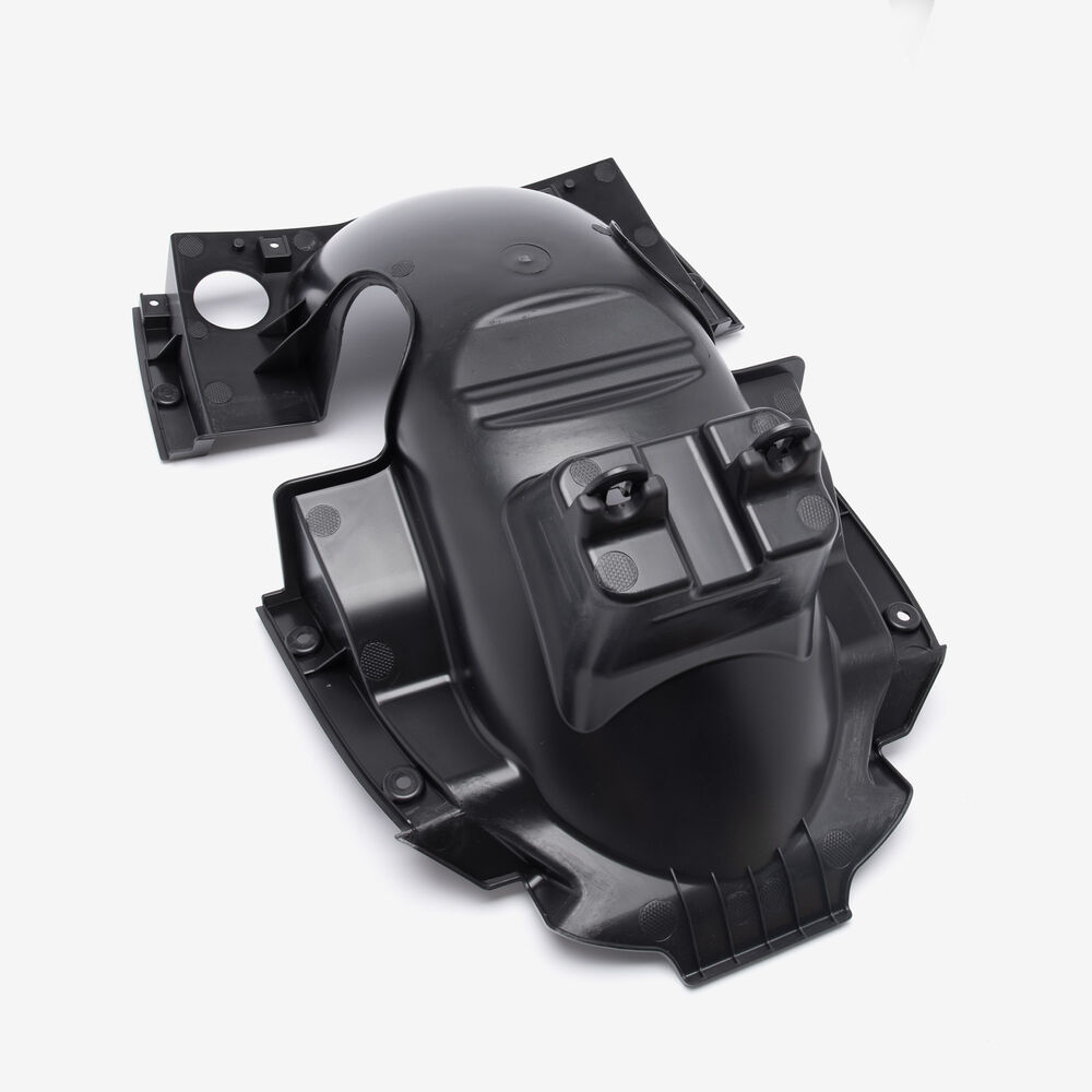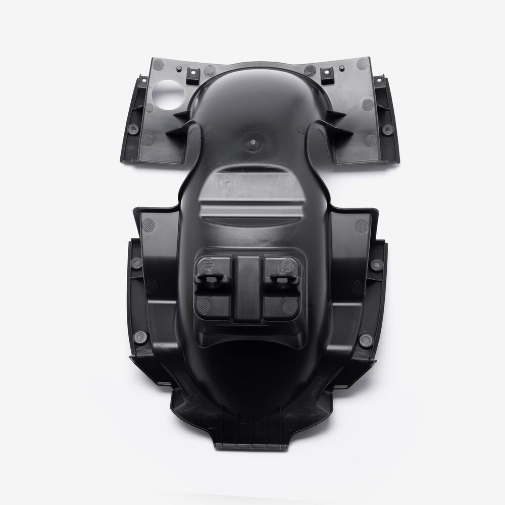 The rear mudguard on a motorcycle is a protective panel mounted above the rear wheel to shield the bike and rider from water, mud, and debris kicked up by the tire. It helps keep the rear of the motorcycle cleaner and improves visibility by preventing splashes.